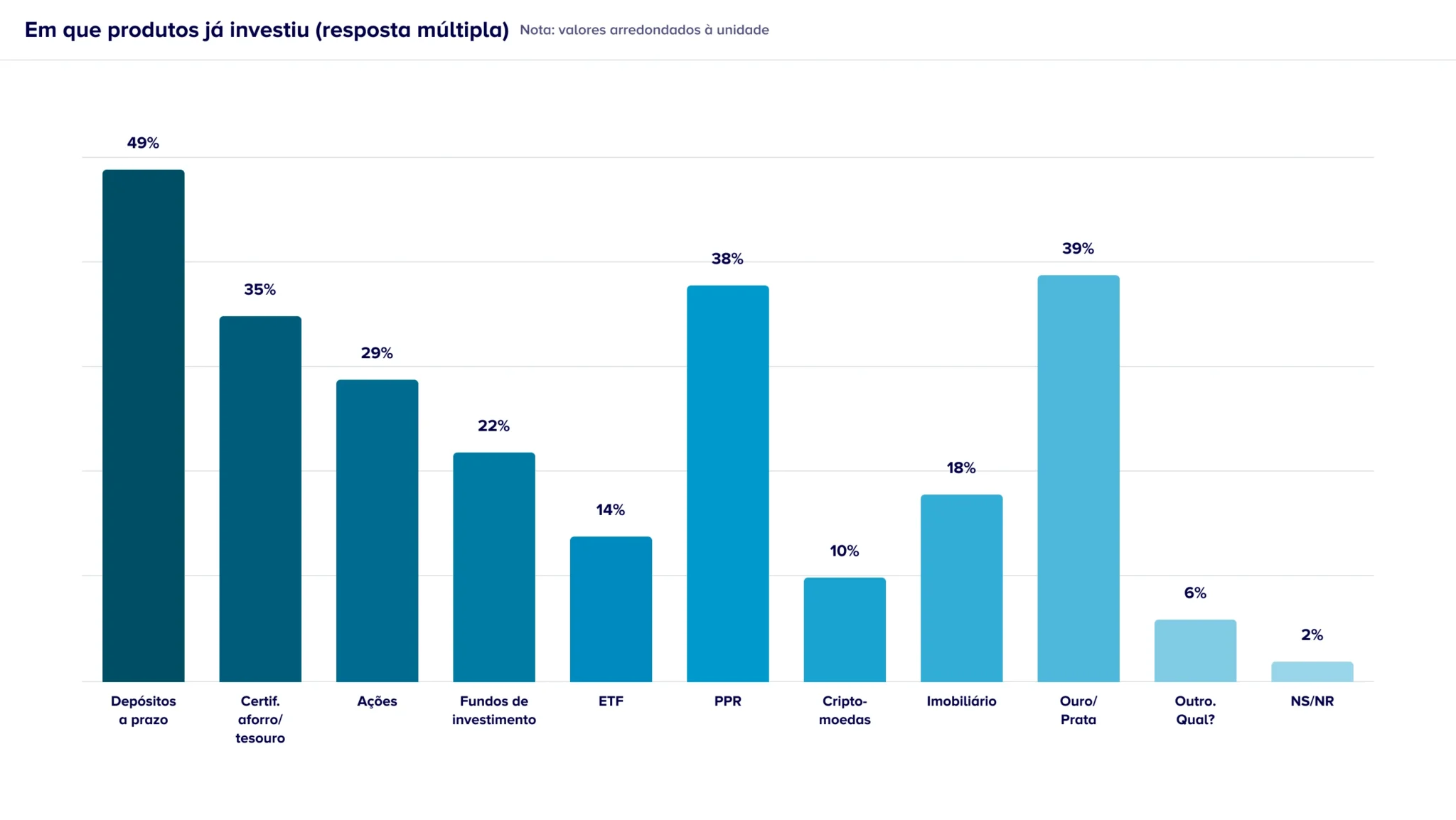 E as estratégias são sobretudo focadas na segurança: nove em cada dez investidores classificam-se como conservadores ou moderados, o que ajuda a explicar a opção por instrumentos de capital garantido, como depósitos a prazo (49%), planos poupança reforma – PPR (38%) e certificados de aforro ou tesouro (35%).