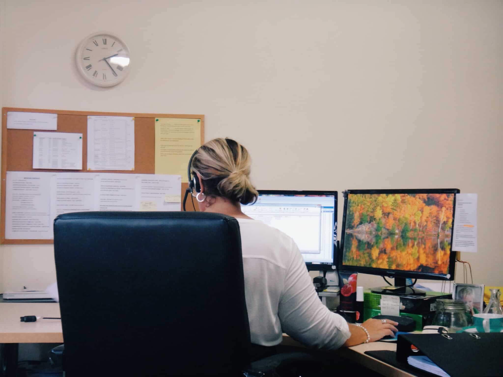 TRabalhadora sentada à secretária, em frente ao computador. Em frente tem um placar com folhas penduradas e um relógio de parede