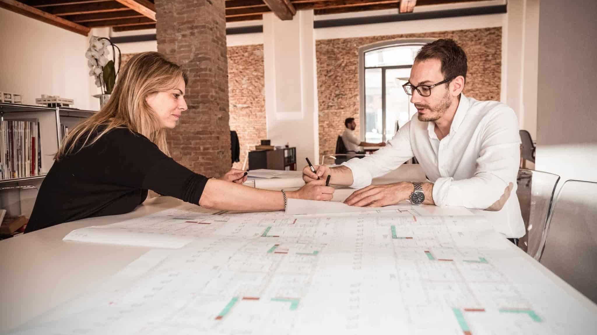 dois arquitectos a trabalhar num projecto em cima de uma mesa