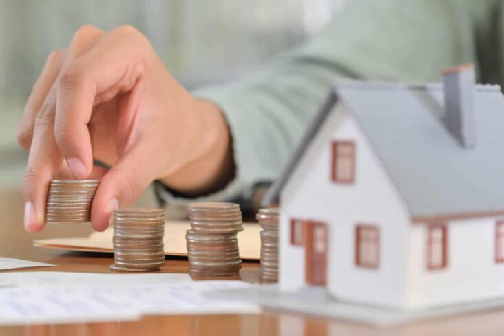 uma casa, com uma pessoa a colocar moedas ao lado e papeis na mesa a ilustrar quanto custa fazer um crédito habitação