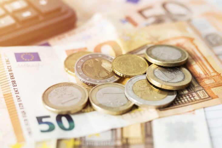 várias moedas de euro em cima de uma nota de 50 euros. Ao lado uma calculadora