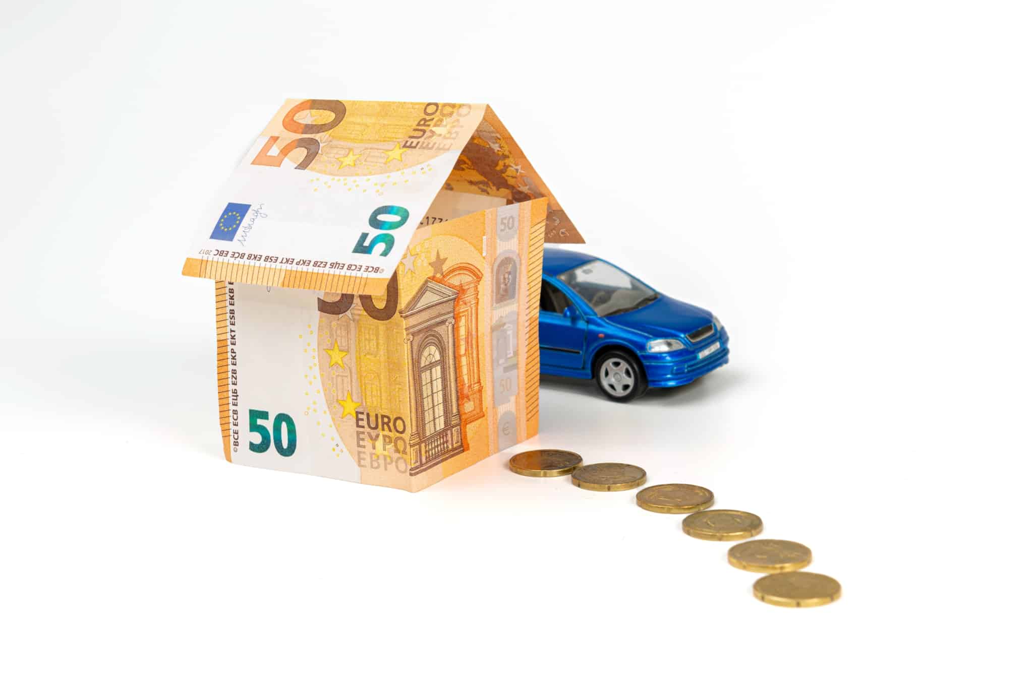 produção fotográfica com uma casinha feia de notas de 50 euros, um carrinho azul de brincar a fazer um caminho com moedas