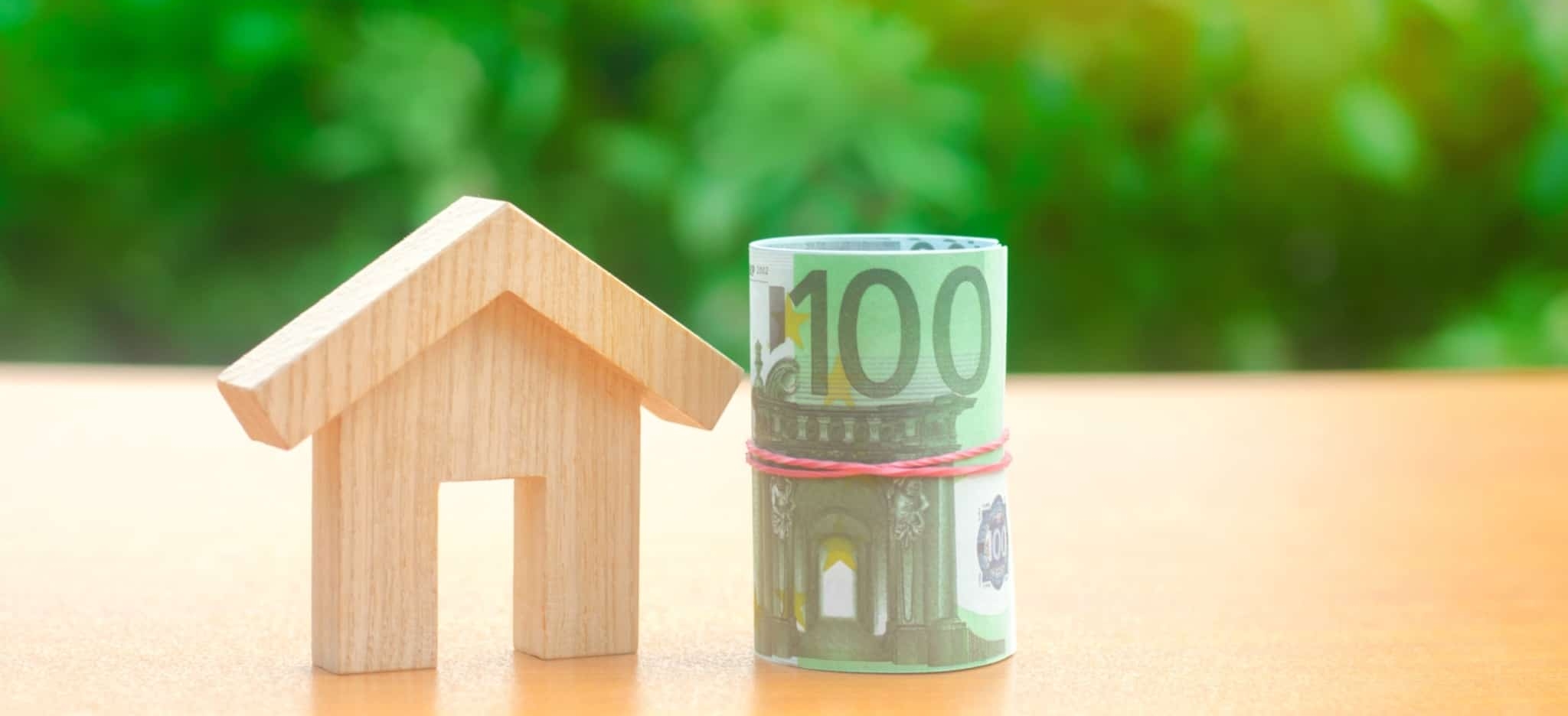 Miniatura de uma casa em madeira ao lado de um rolo de notas de 100 euros