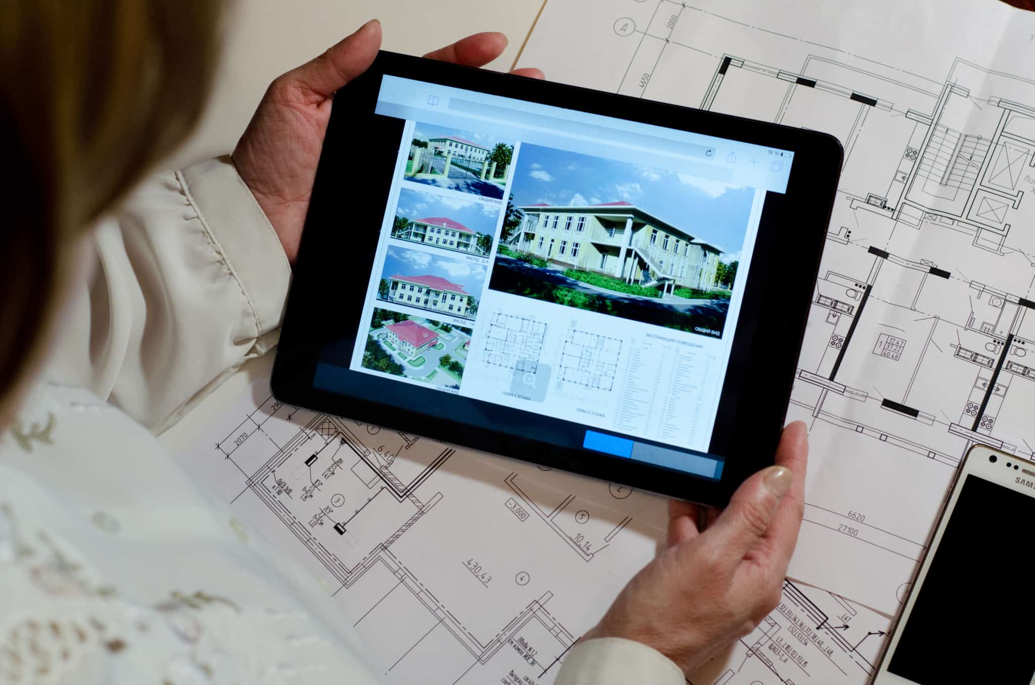 Mulher visualiza uma planta de casa através de um tablet