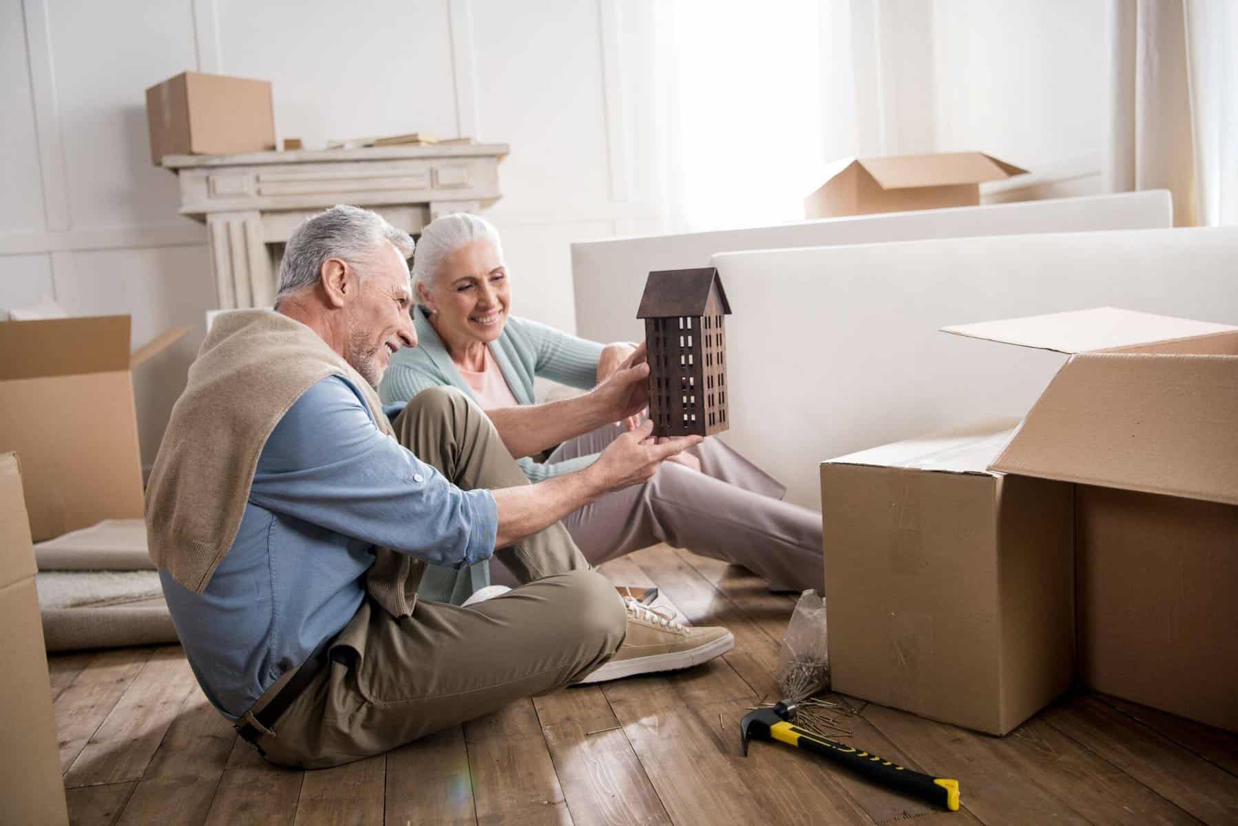 Casal sénior a desencaixotar nas mudanças após compra de nova após os 50 anos