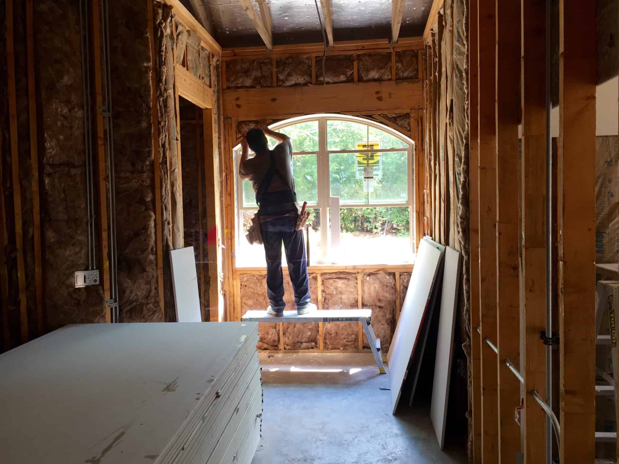 homem a construir o interior de uma casa, trabalha junto a uma janela