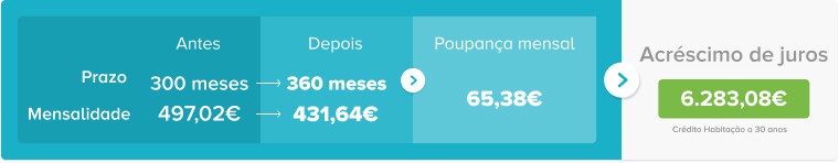 Por exemplo, se aumentar o prazo do crédito habitação terá uma poupança na sua prestação mensal de crédito. No entanto, a longo prazo, o valor total a pagar ao banco será mais elevado, pois pagará juros durante um prazo maior ao estabelecido.