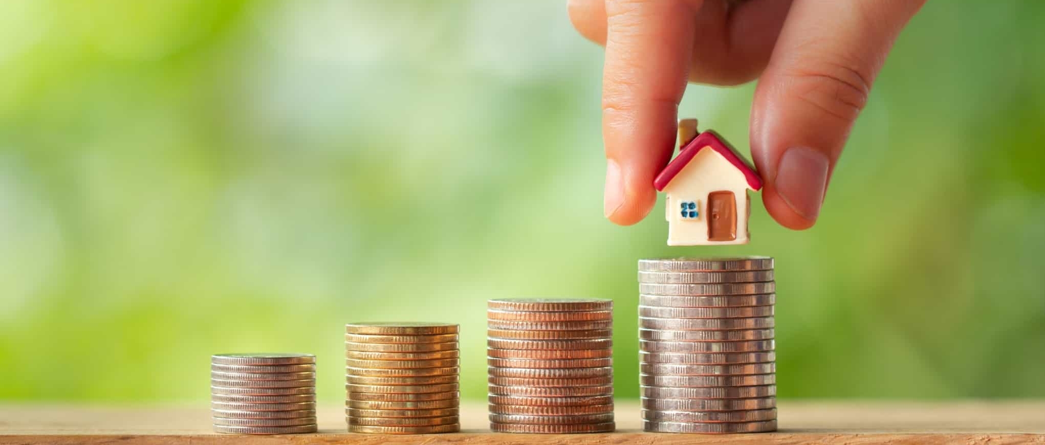 mão a colocar uma casa miniatura numa pilha de moedas
