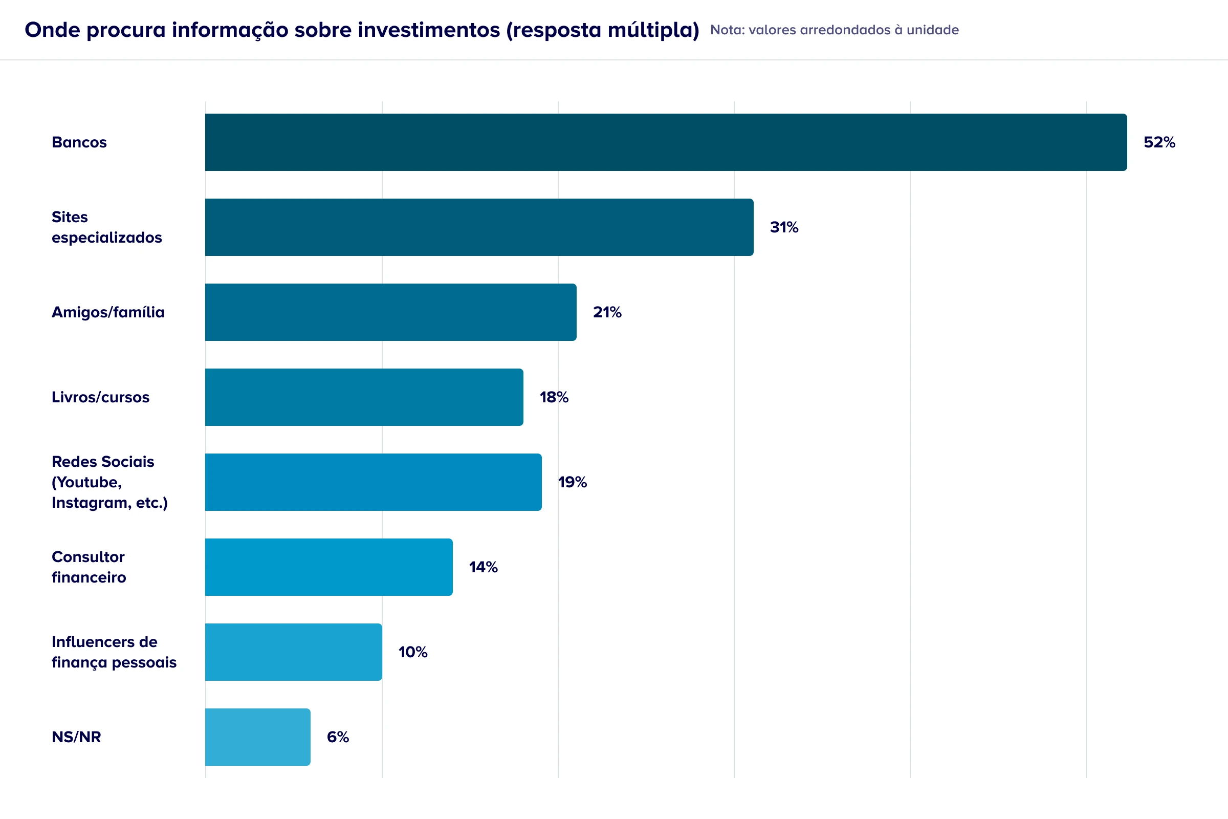 Quando procuram orientação sobre investimentos, mais de metade (52%) recorre aos bancos. Os sites especializados surgem em segundo lugar, com 31%, seguidos de amigos e família (21%).