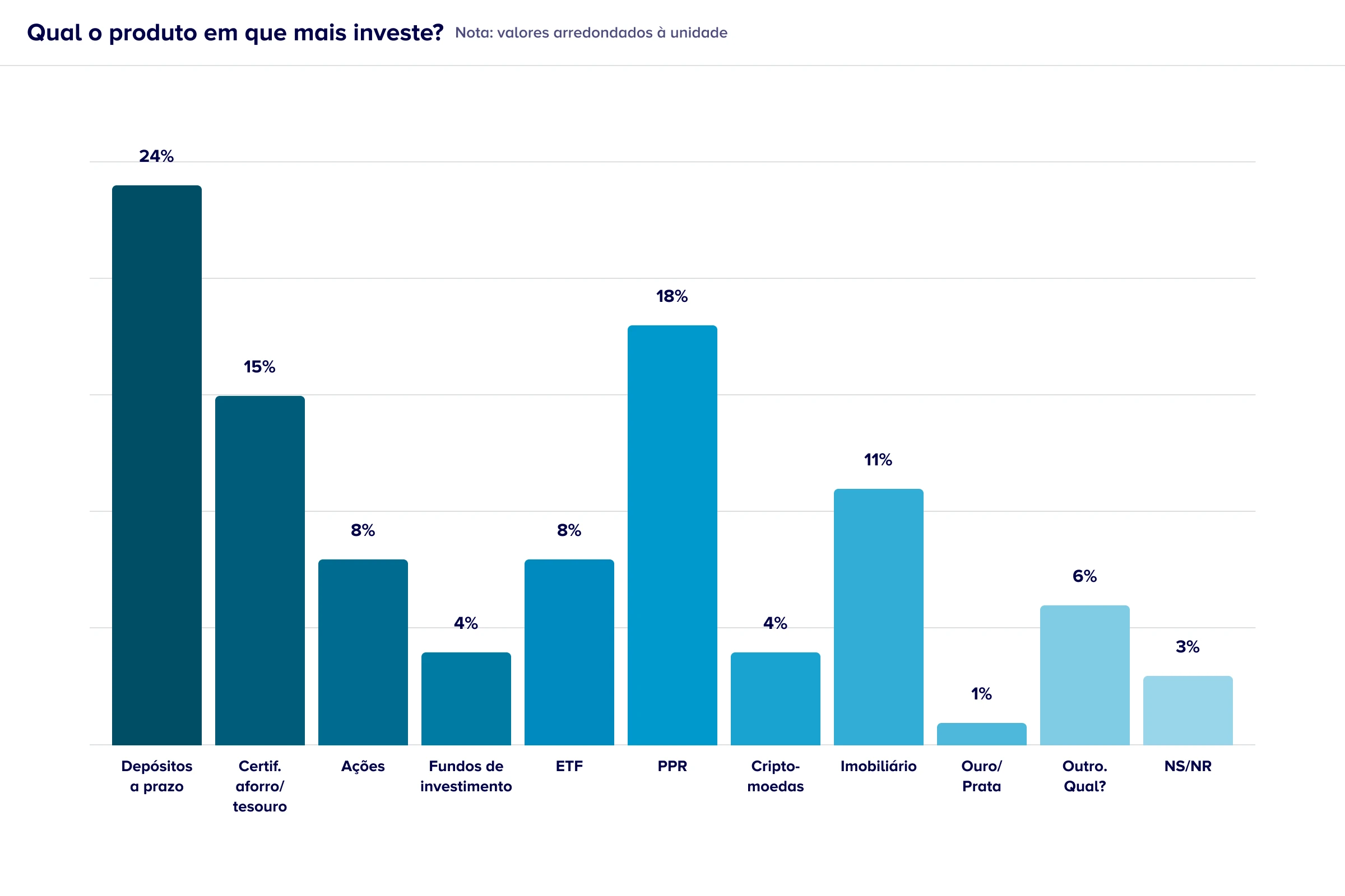 No estudo, quando questionados sobre os produtos em que já investiram, praticamente metade dos inquiridos (49%) apontou os depósitos a prazo, 38% os Planos Poupança Reforma (PPR) e 35% os certificados de aforro ou do Tesouro. Uma seleção que reflete “a tradicional preferência portuguesa por aplicações seguras e de baixo risco”, sublinha o relatório.