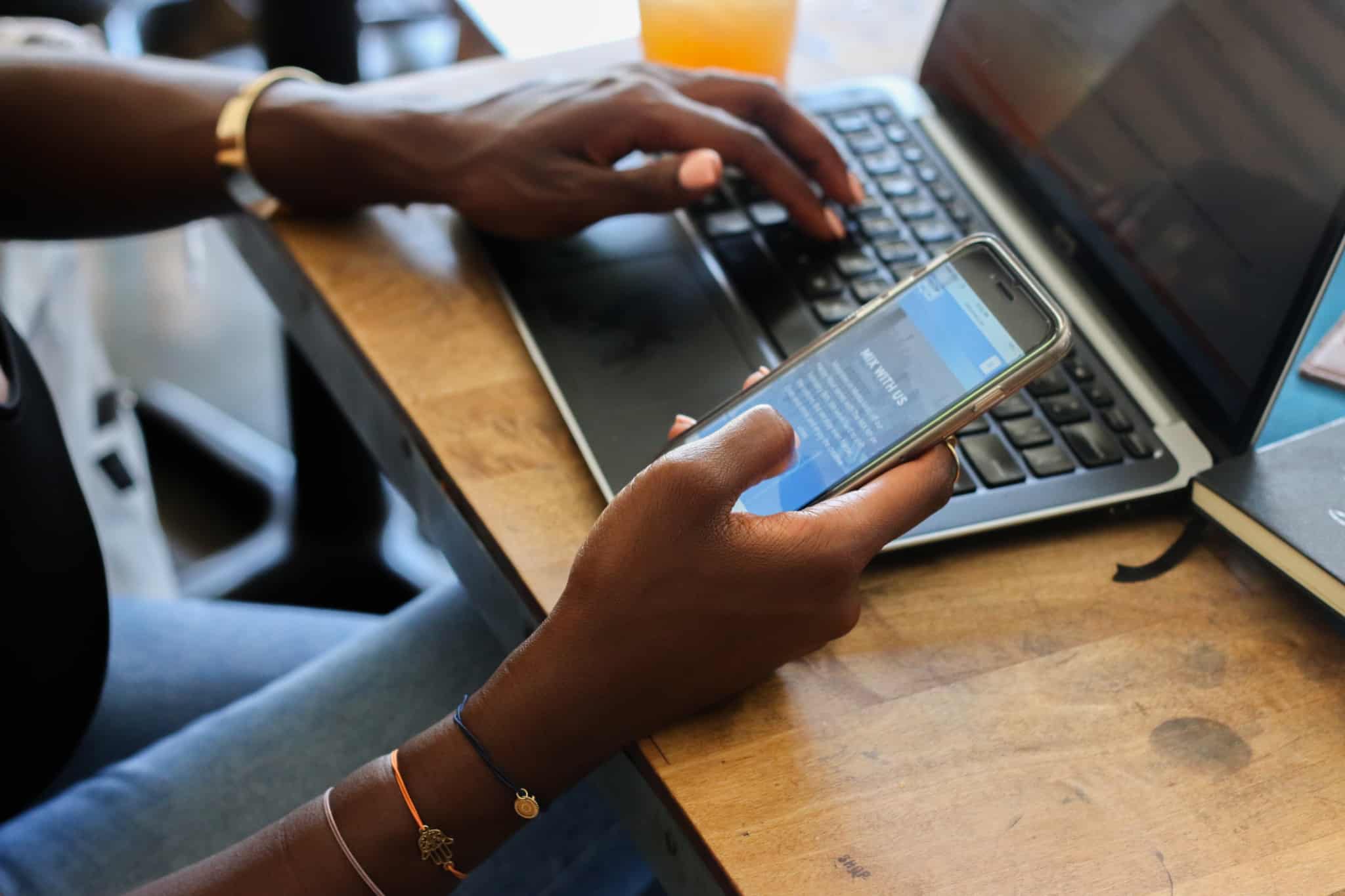 jovem mulher empreendedora consulta app no telemóvel, enquanto trabalha no seu computador portátil