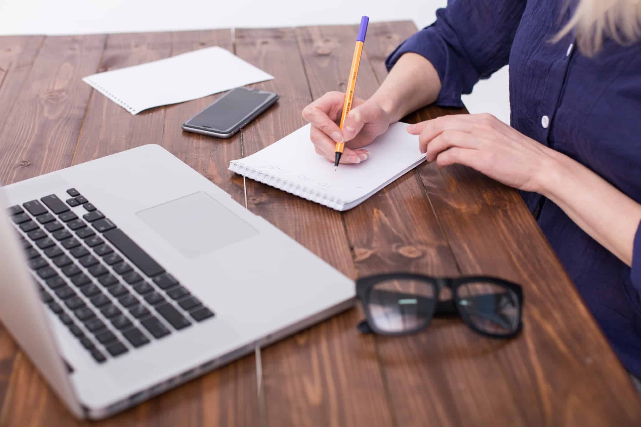 pessoa com computador a frente escreve num bloco de notas a lapis