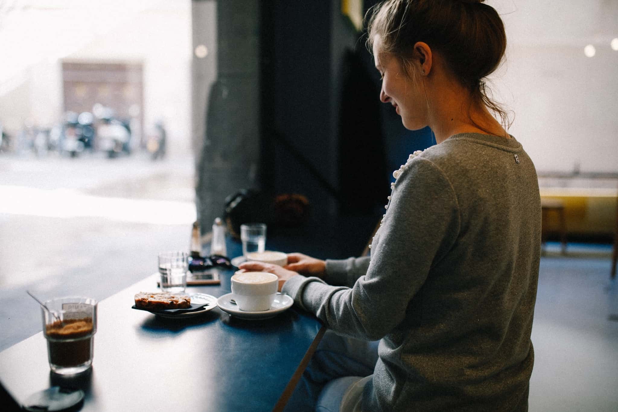 Rapariga num café a comer e a beber enquanto mexe no telemóvel
