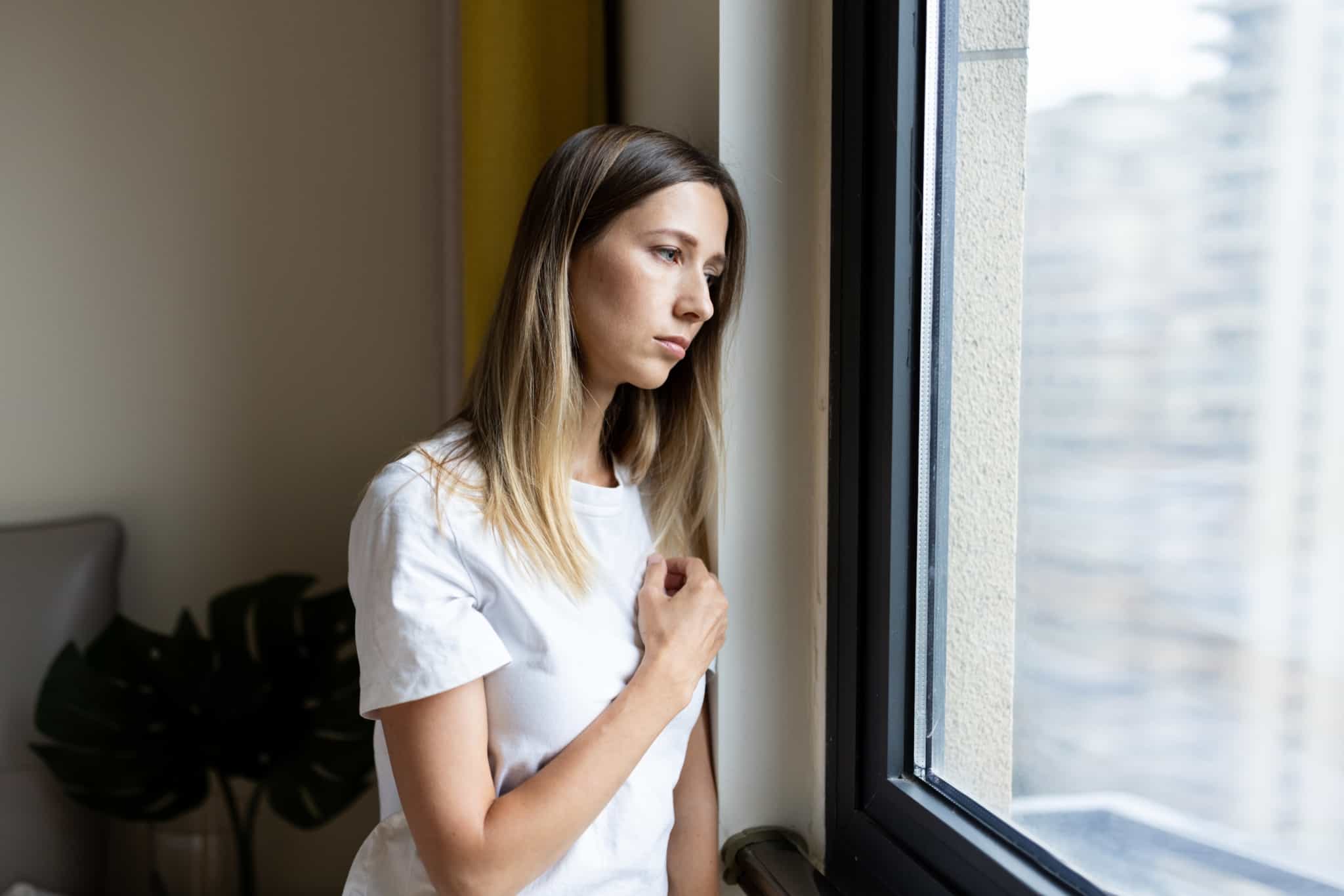 jovem mulher olha pela janela da sua casa, com expressão carregada e preocupada