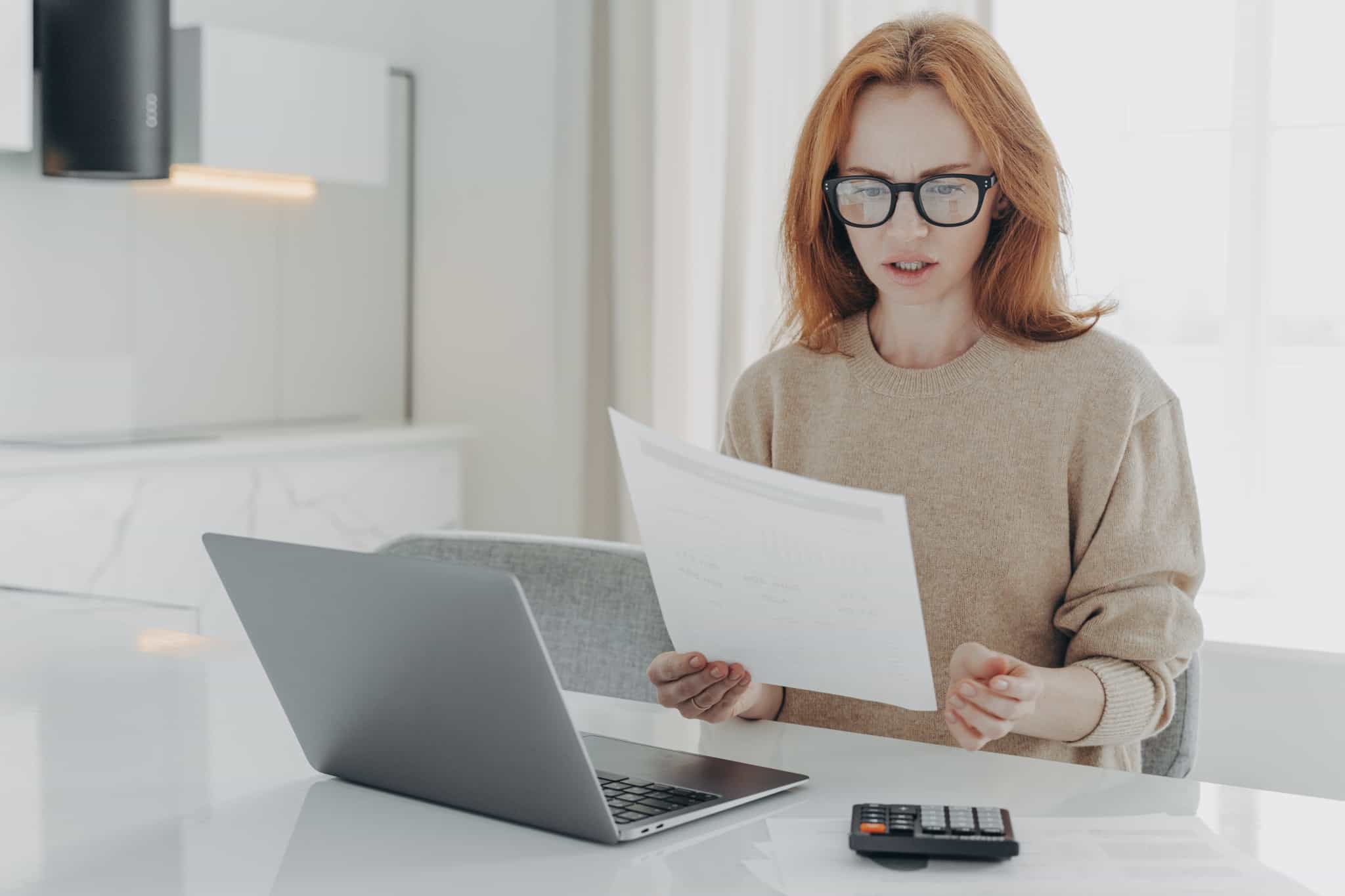 jovem mulher consulta documentos e com o apoio da calculadora apura o valor do IVA a pagar, enquanto trabalhadora independente