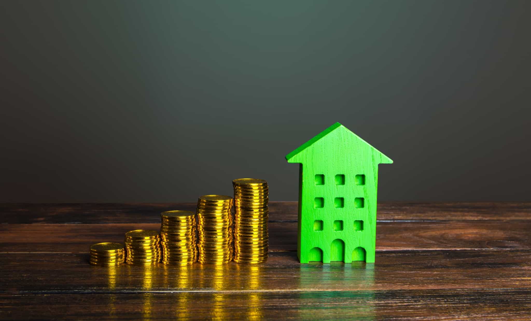 produção fotográfica mostra, em fundo escuro, uma maquete de fachada de um prédio, em madeira e verde para apontar para a sustentabilidade, e ao lado pilhas em crescendo de moedas, apontando para a poupança. o conjunto ilustra a necessidade de investir eficiência energética