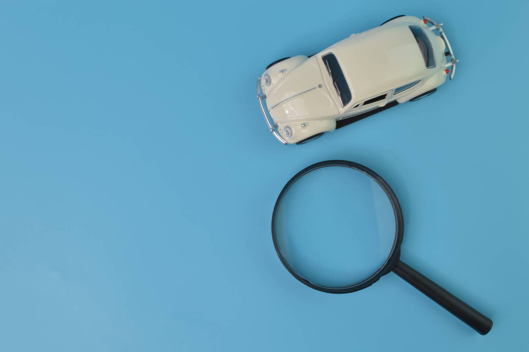 imagem com fundo azul com uma lupa e um carro a ilustrar 8 dicas para reduzir os encargos mensais com o seu automóvel