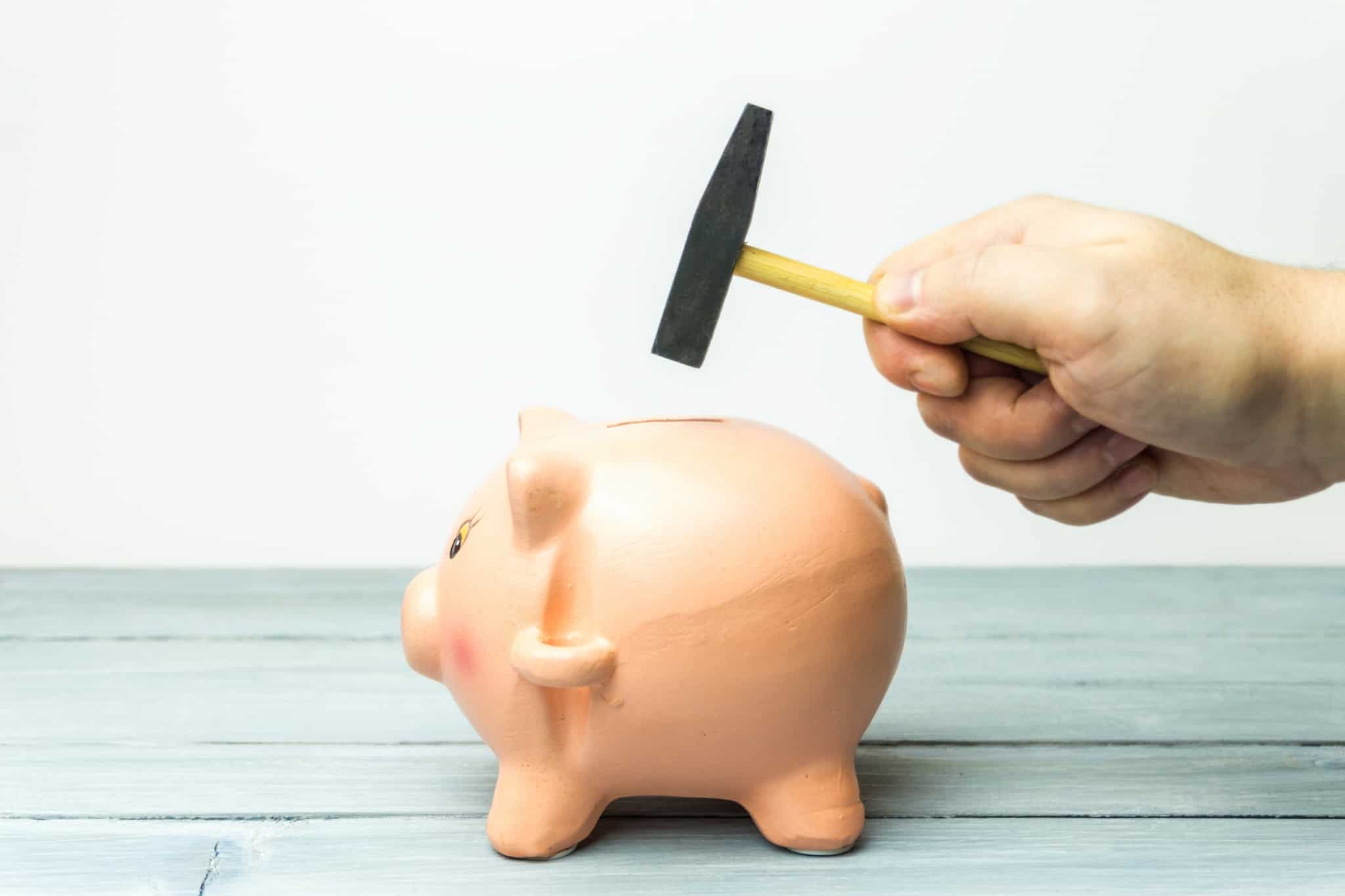 produção fotográfica de um mealheiro e uma mão com um martelo que se aproxima