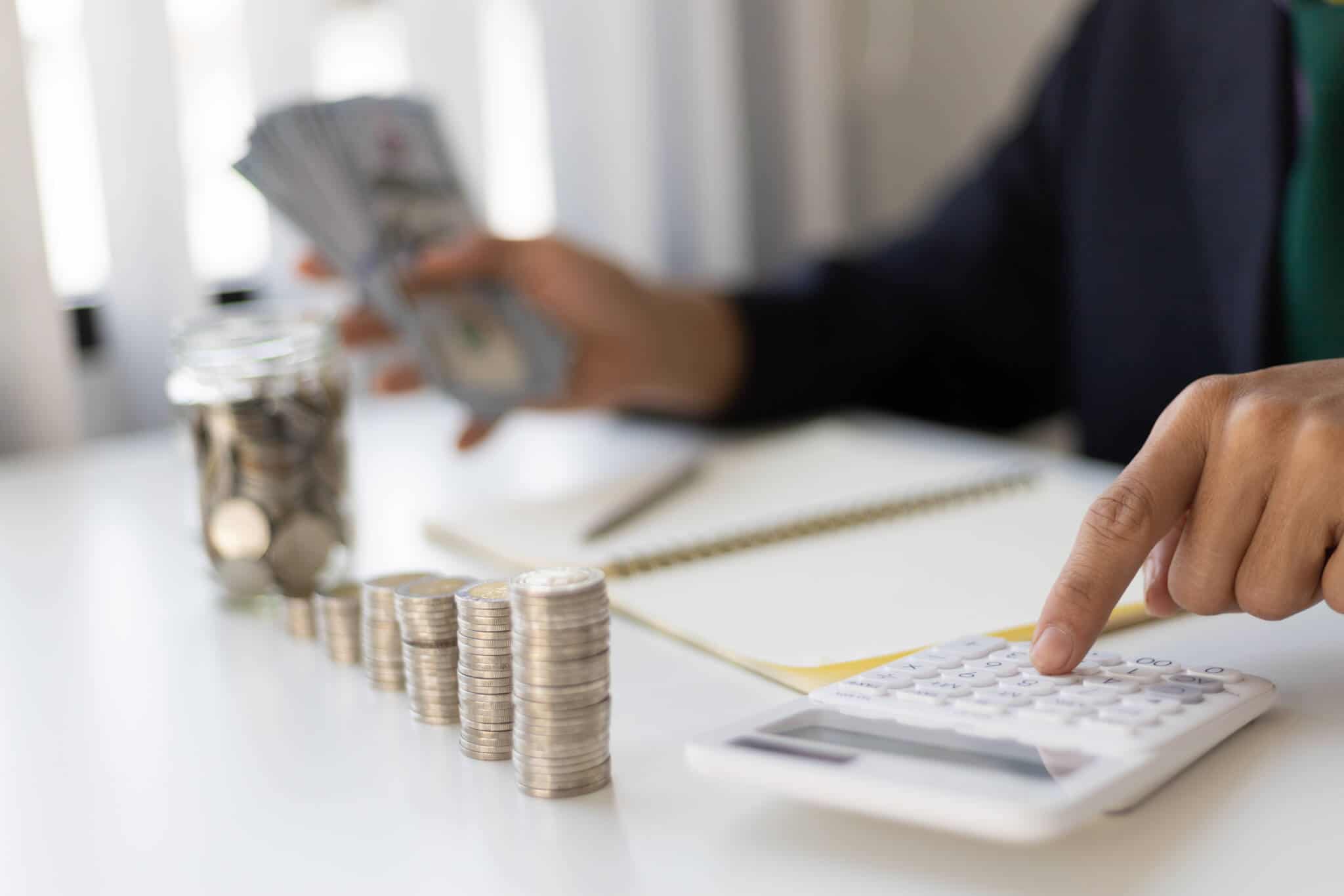 homem a fazer cálculos numa máquina feente a pilhas de moedas em crescendo e segurando um molho de notas na outras mão faz conta aos ganhos do PPR Europeu
