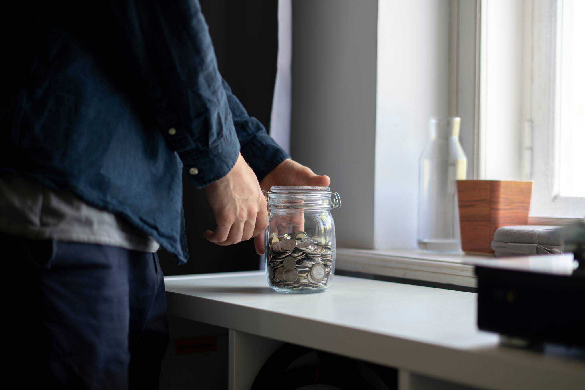 jovem home junto a janela segira pode de vidro com muitas moedas que vai juntando para a reforma