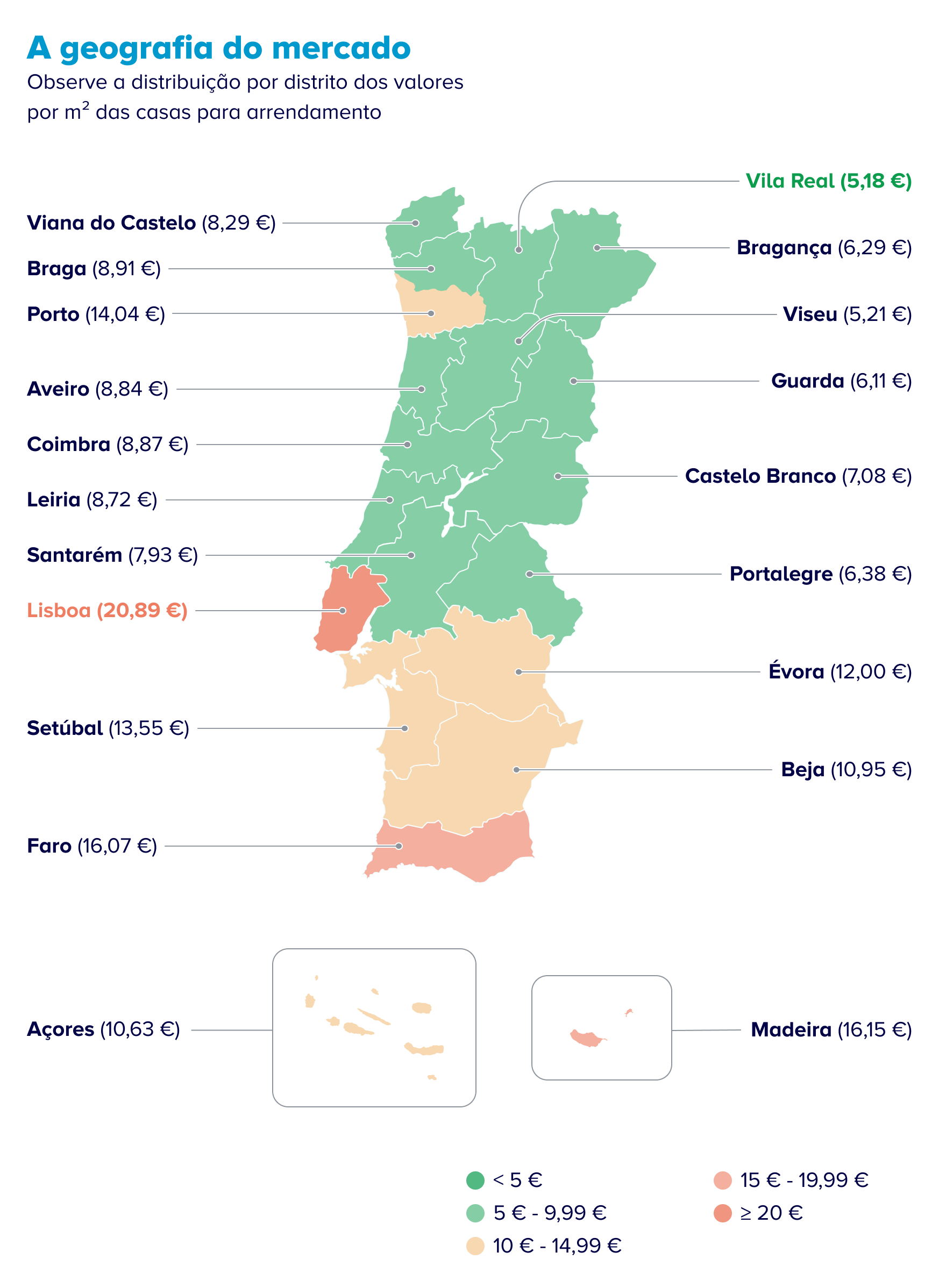 No interior dos dois distritos mais populosos do país, as diferenças entre municípios também são muito significativas. Em Lisboa, apenas a própria capital e Cascais estão acima dos 20 euros/m², seguindo-se: