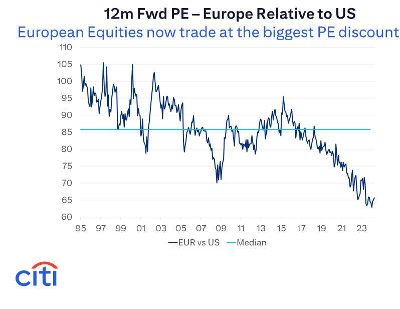 Tendo em conta esta métrica, as ações norte-americanas estão a transacionar com um prémio próximo de 70% face às europeias, o que, só por si, não significa que as ações europeias estejam mais baratas (ou as norte-americanas mais caras). Mas o múltiplo do S&P500 está bem acima da média, enquanto o índice europeu mais alinhado com os dados históricos. O Citigroup, um dos bancos que atualmente prefere as ações europeias face às norte-americanas, calcula que o diferencial entre o PER dos dois índices nunca foi tão largo, como é percetível na imagem em baixo.