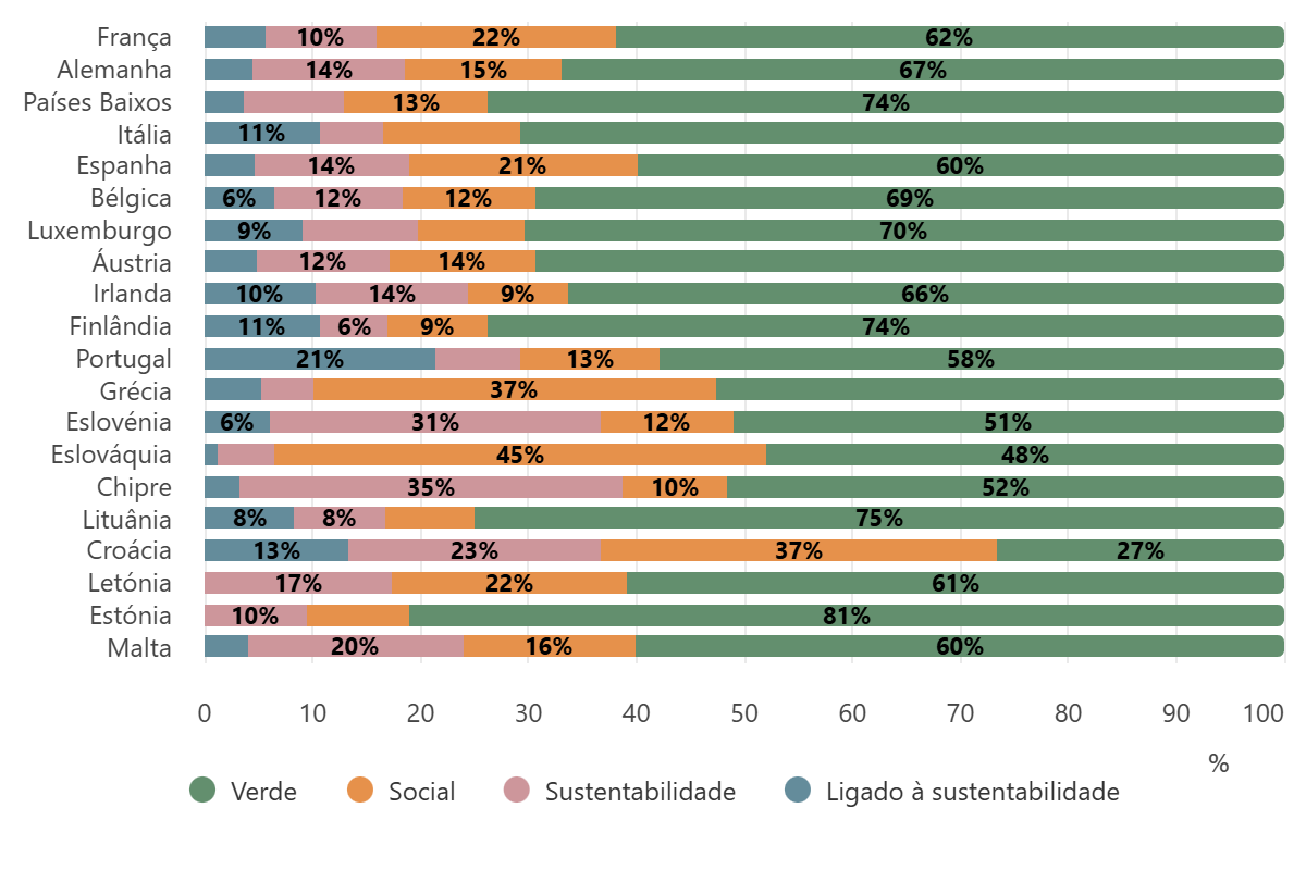 “A categoria ‘ligado à sustentabilidade’ pesava menos do que em Portugal (9%). Já os títulos ESG destinados a projetos com impacto social positivo tinham maior relevância (17%)”.