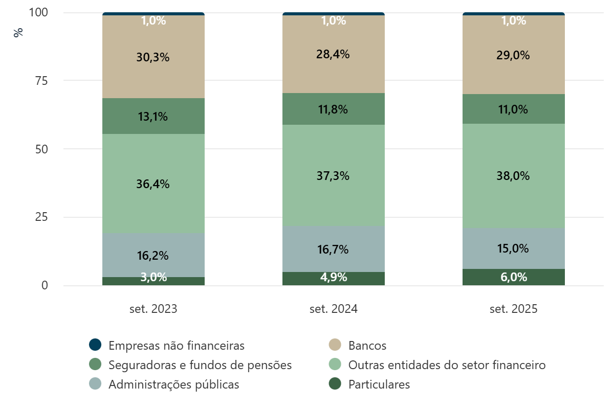 A eles juntam-se as seguradoras e fundos de pensões (31%), e as outras entidades financeiras (11%). Os investidores particulares representam 6% do montante investido a partir de Portugal.