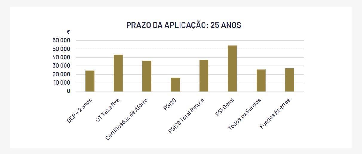 As aplicações em obrigações do Tesouro, certificados de Aforro, PSI Geral, fundos de poupança reforma e outros fundos de investimento com risco mais elevado permitiriam ao investidor ganhos de poder de compra, uma vez que o montante acumulado após 25 anos seria superior ao que resultaria da remuneração da poupança à taxa de inflação. O mesmo não se pode dizer dos depósitos a prazo, que perderiam mais de 3 mil euros para a inflação neste período.