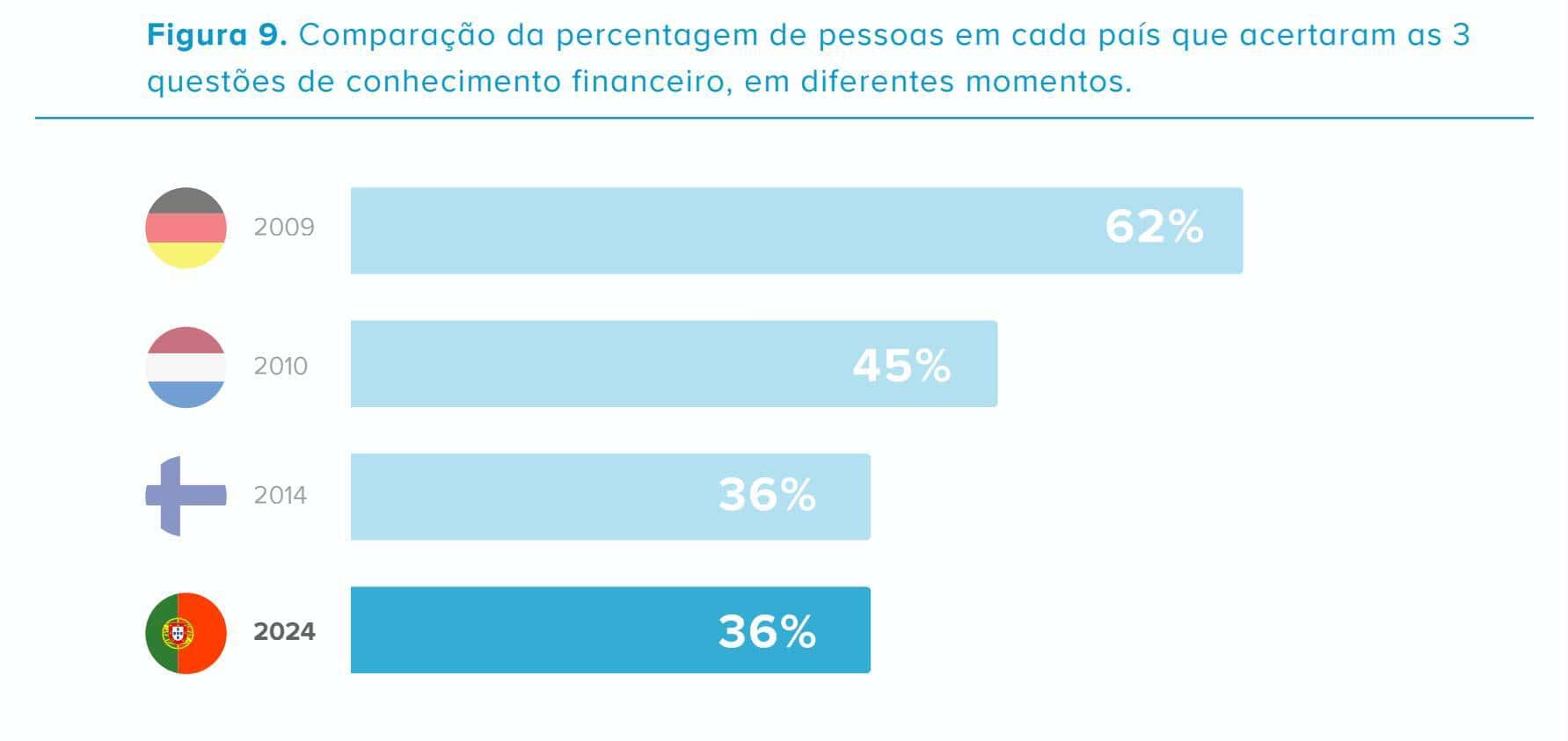Para ter um bom nível de conhecimento financeiro é preciso acertar em todas as questões, algo que apenas 36% dos portugueses conseguiu, em 2024. Em comparação, 62% dos alemães responderam corretamente a estas perguntas, em 2009. Um ano depois, a percentagem de respostas certas nos Países Baixos foi de 45%.