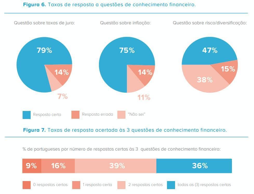 79% dos portugueses souberam responder à questão sobre juros, sendo este o tema que teve a maior percentagem de acerto. Do lado oposto está a pergunta sobre risco e diversificação nos investimentos, com 47% de respostas certas. Por fim, 75% dos inquiridos responderam corretamente à questão sobre inflação.