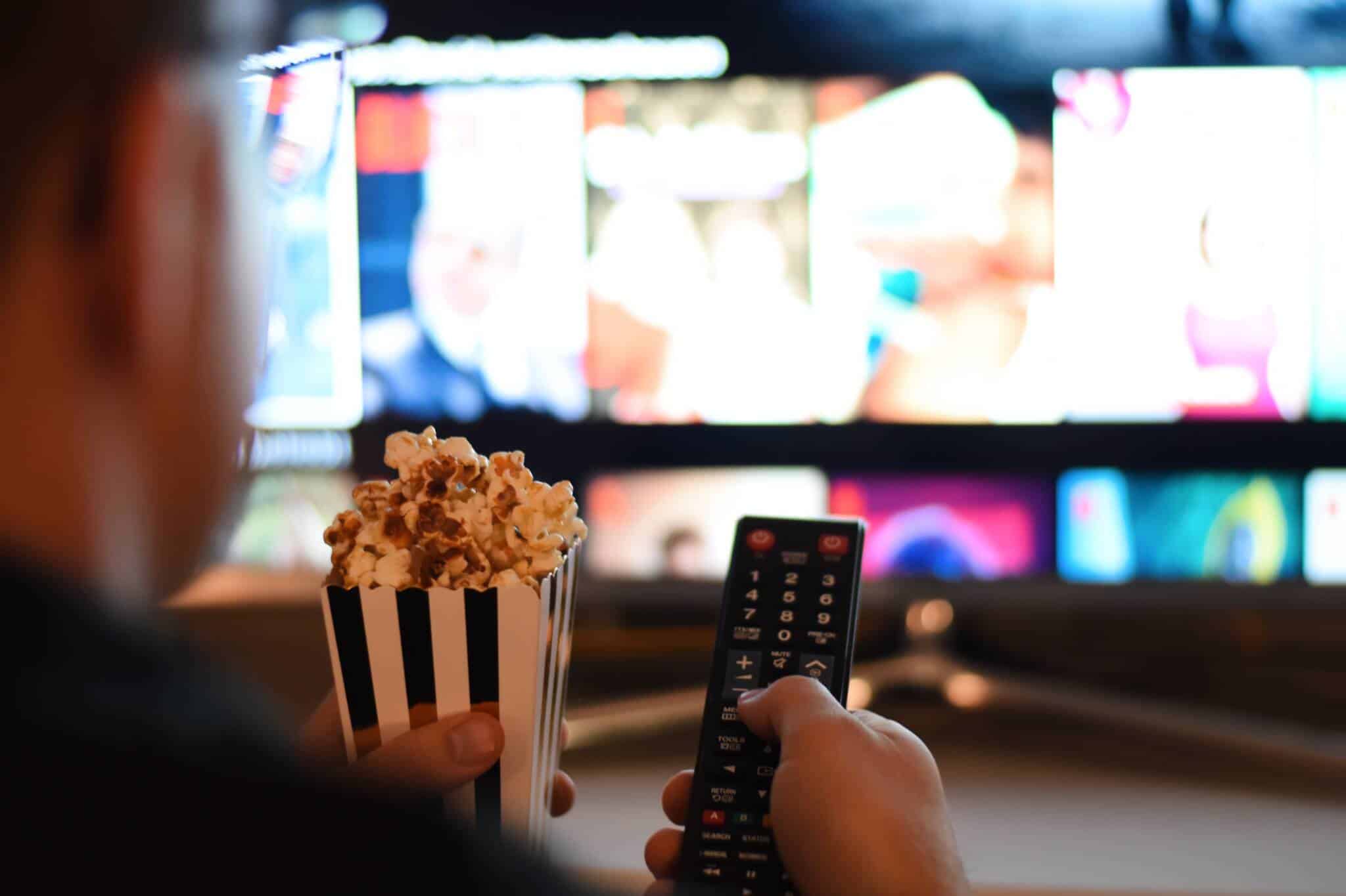 frente a uma televisão, com ecran desfocado, a mão de um jovem rapaz segura comando e pipocas, pronto para ver filmes que ajudam na educação financeira