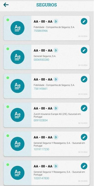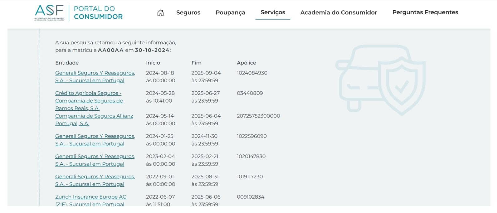 A app leva-o para uma página de resultados, onde ficará a saber se o automóvel está seguro, qual a companhia responsável, bem como o número e prazo das apólices, ao longo dos anos.