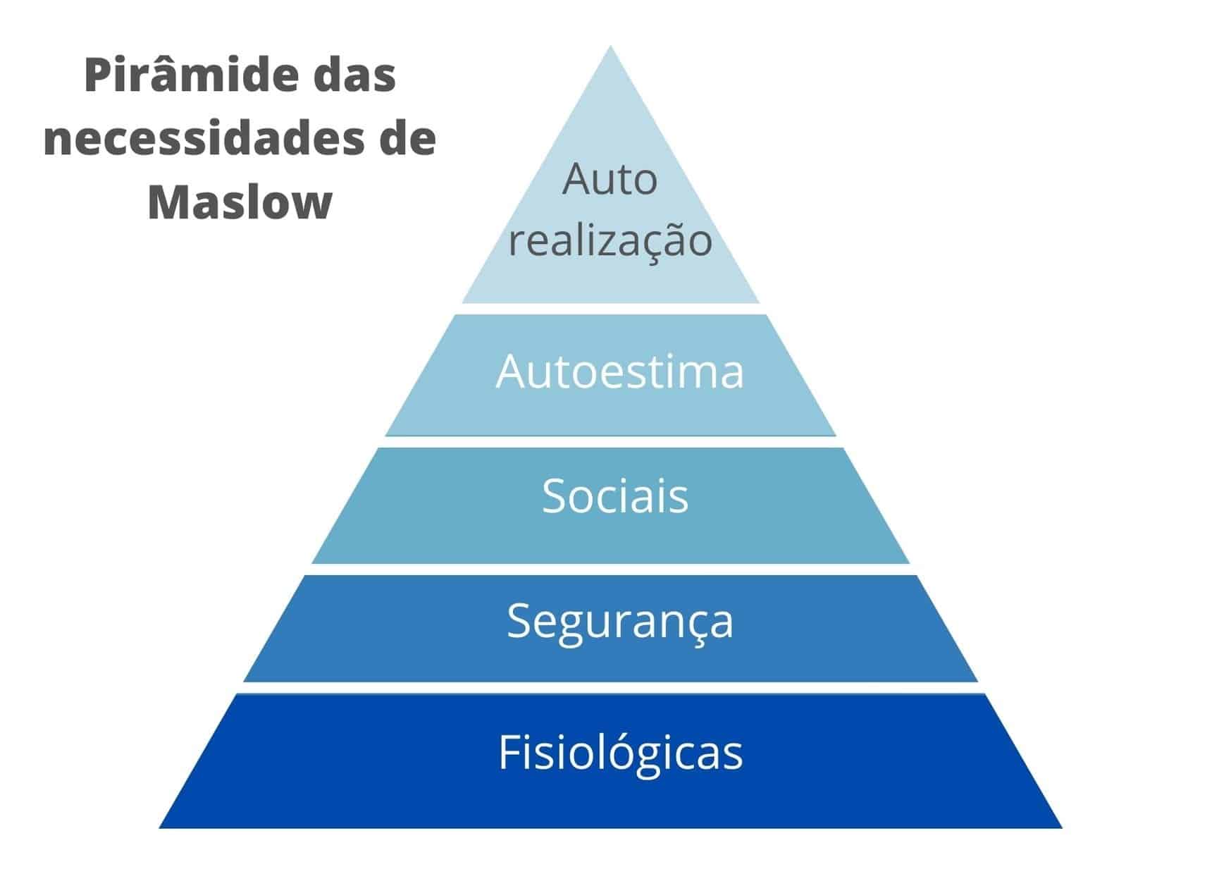 Pirâmide das necessidades de Maslow, com identificação dos vários níveis de necessidades humanas: Fisiológicas, segurança, sociais, autoestima e autorealização