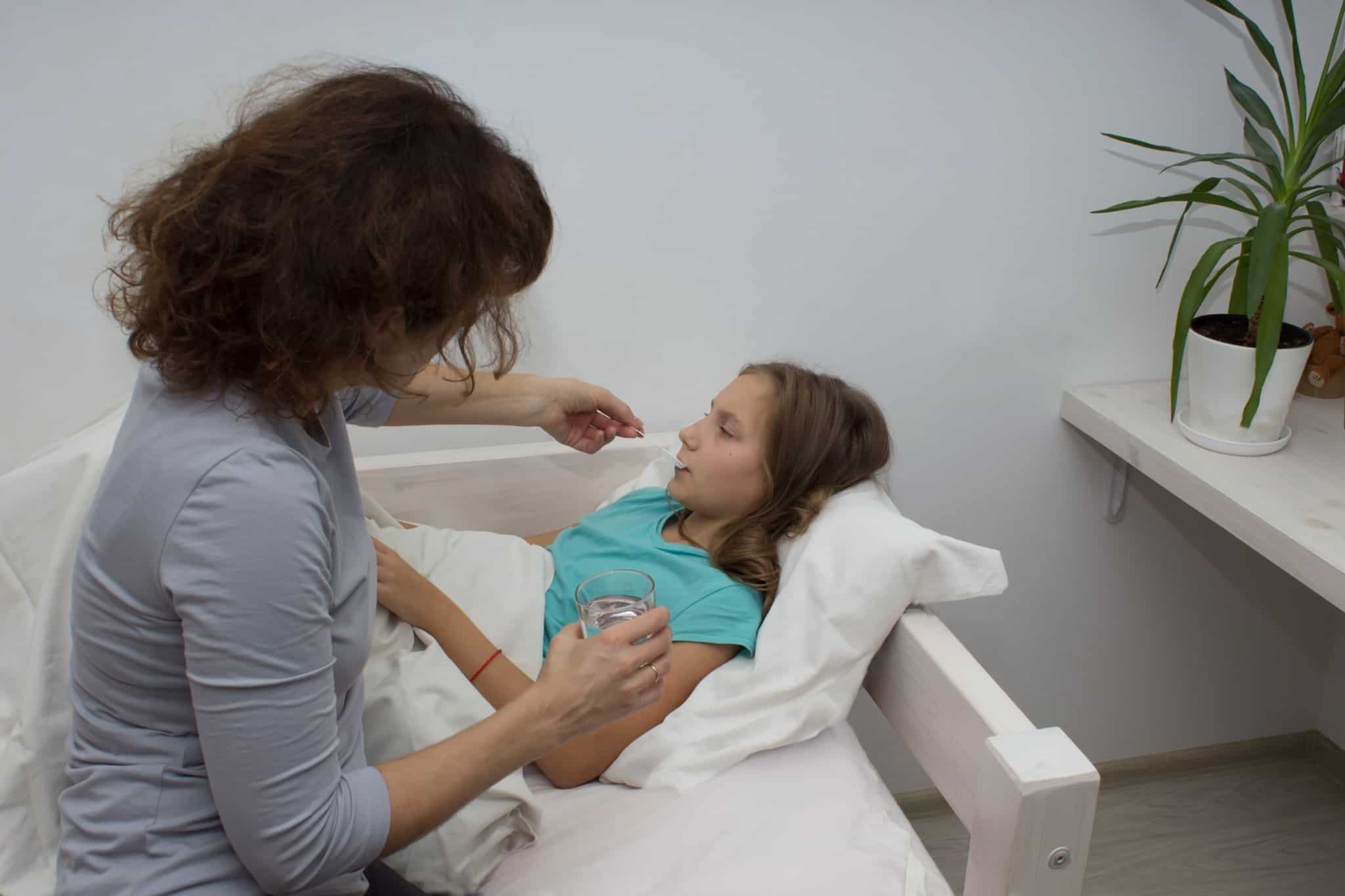 jovem mãe sentada à beira da cama da filha menor presta assistência usufruindo de baixa de apoio à família