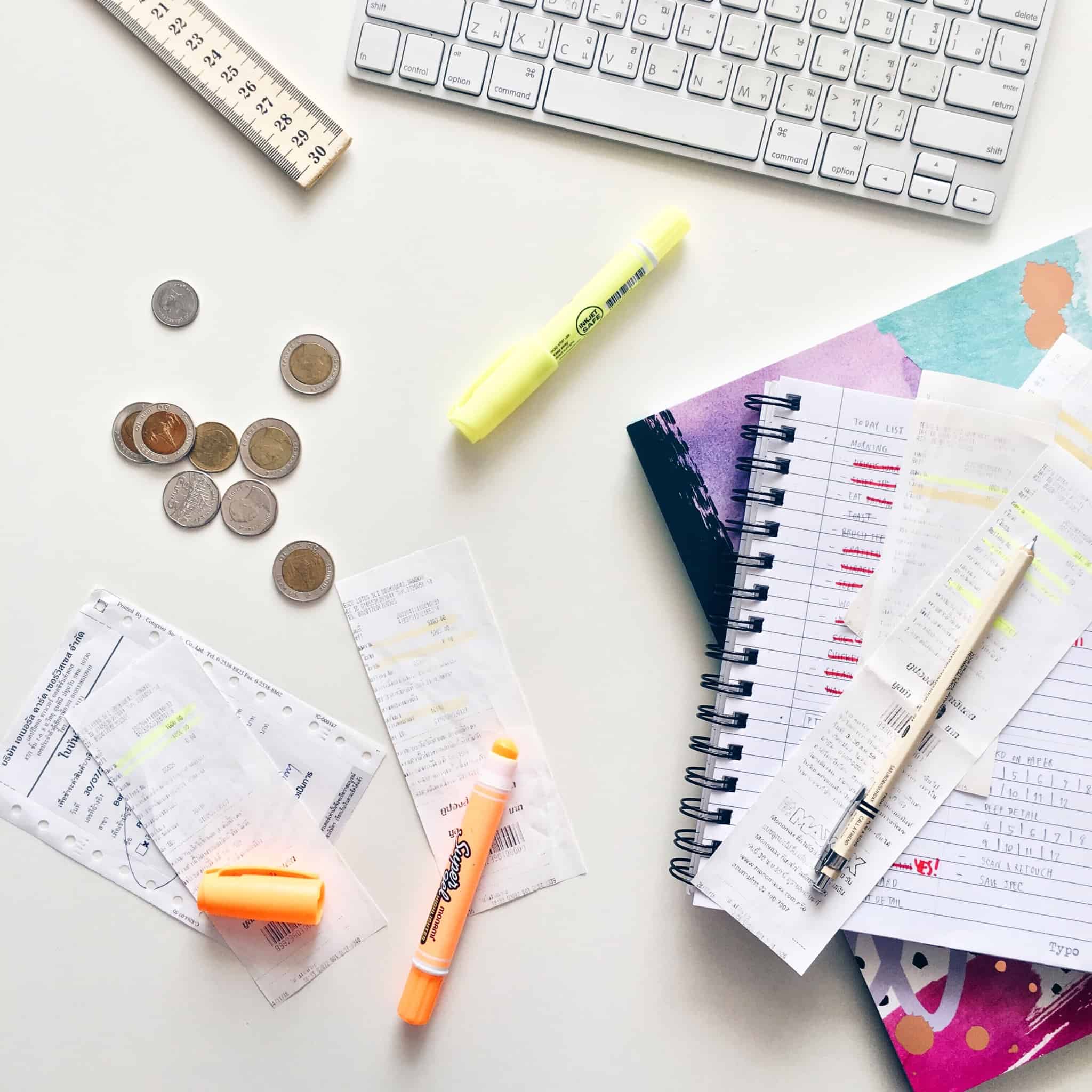 Várias coisas espalhadas em cima de uma mesa branca: um bloco de notas, várias moedas, faturas, marcadores e uma régua