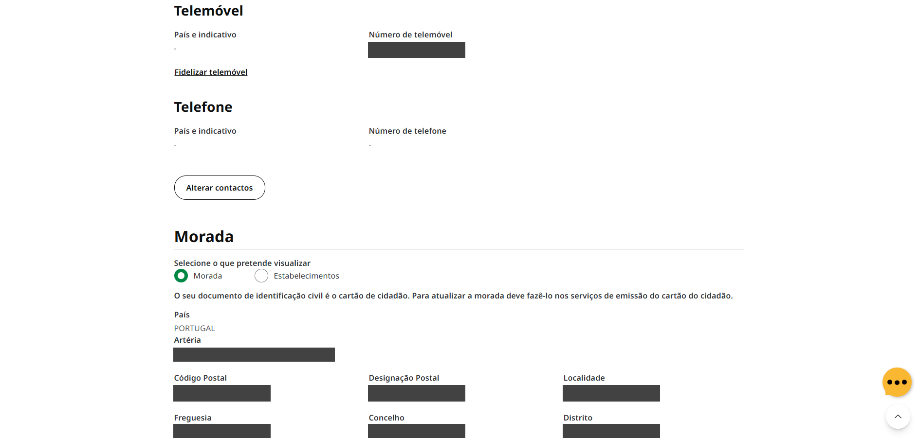 - Aceder a Perfil > Dados pessoais > Consultar e atualizar contactos e alterar a morada na área respetiva.