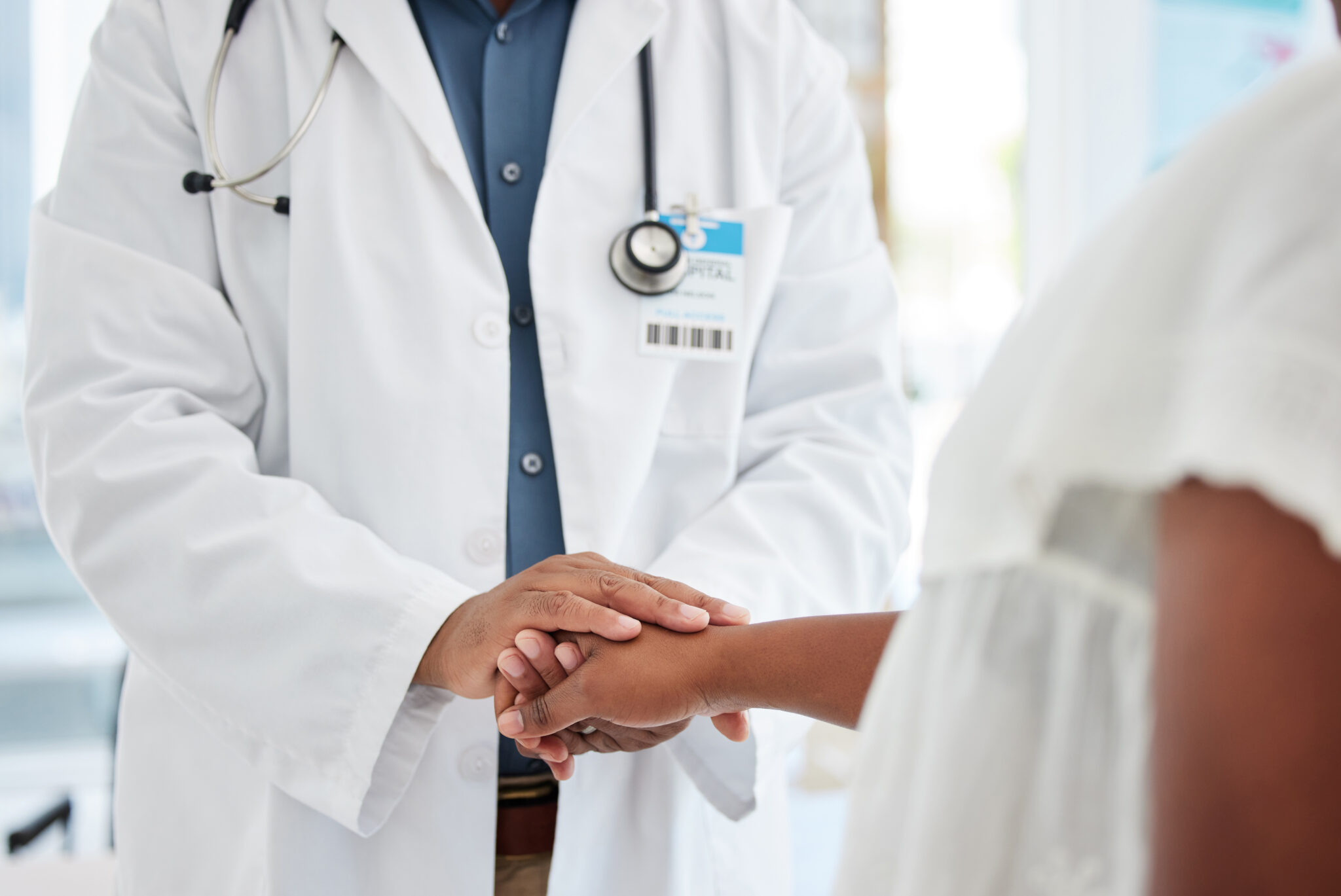 a saúde a ser cuidada por um médico, de bata branca, segura mão de paciente