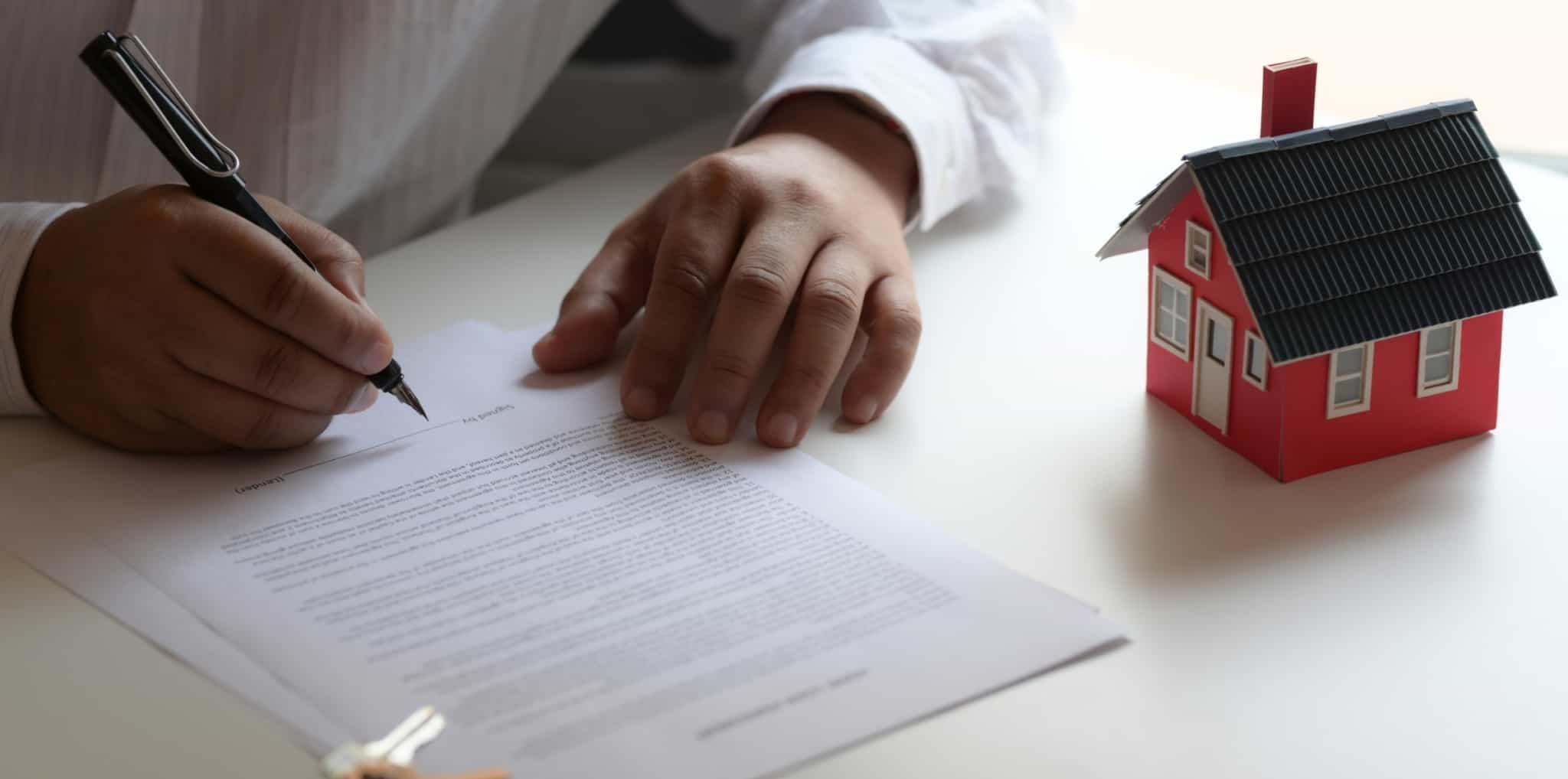 Homem a assinar um contrato para comprar casa, analisando as dívidas ao condomínio
