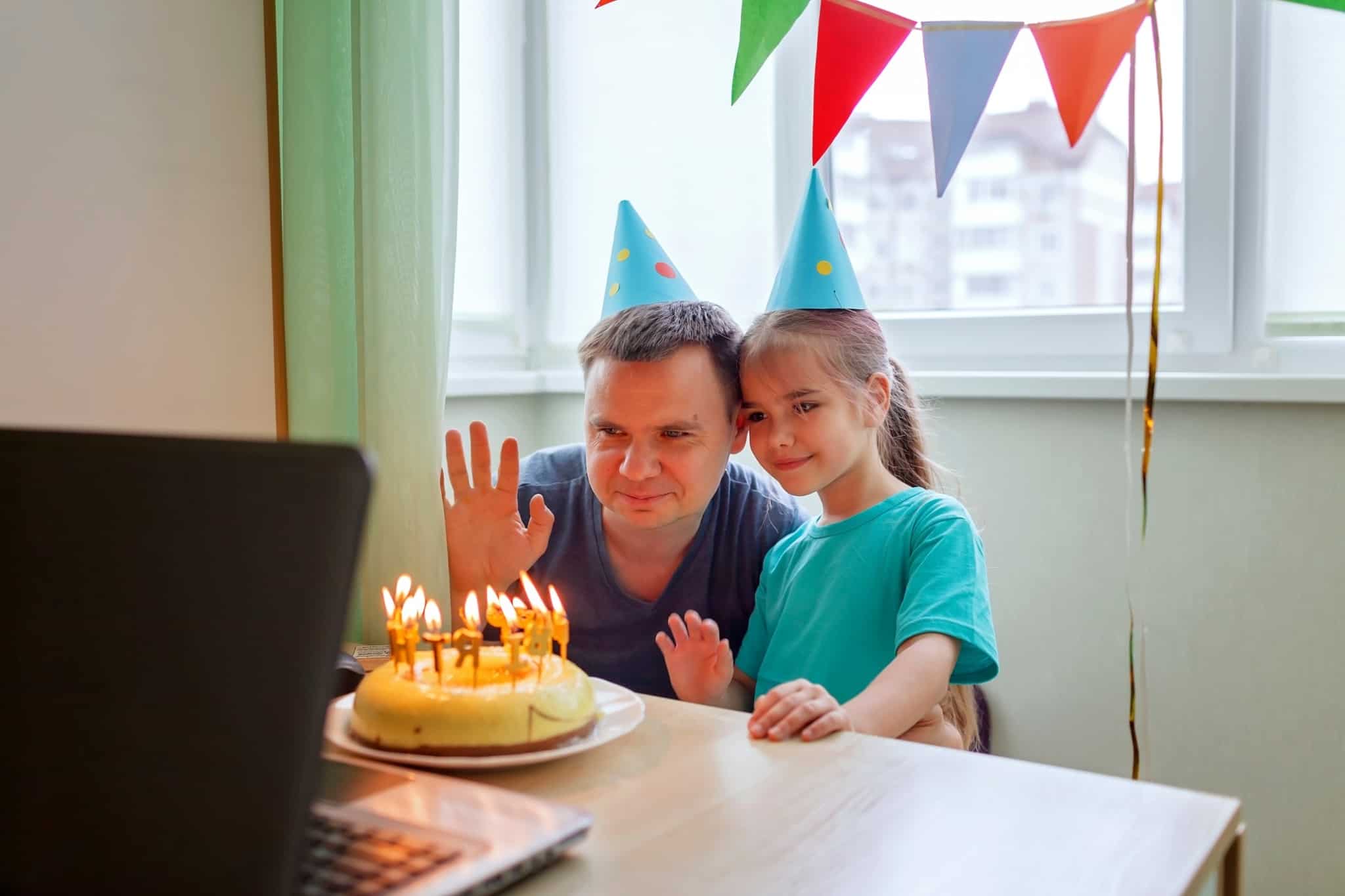 Pai e filha com chapéus de festa de aniversário na cabeça, sentados em frente a um computador e a um bolo com várias velas acesas