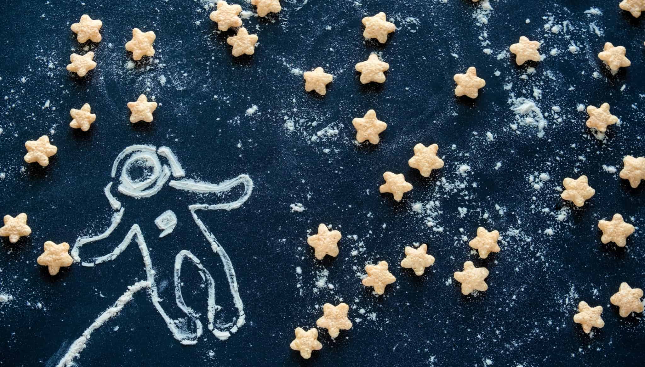 Astronauta desenhado a giz e cereais estrelitas