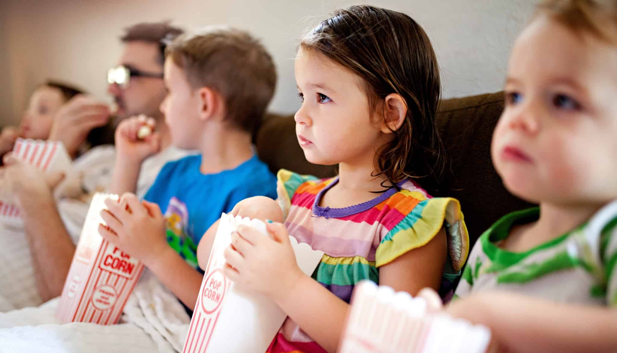 Crianças a verem um filme e a comerem pipocas