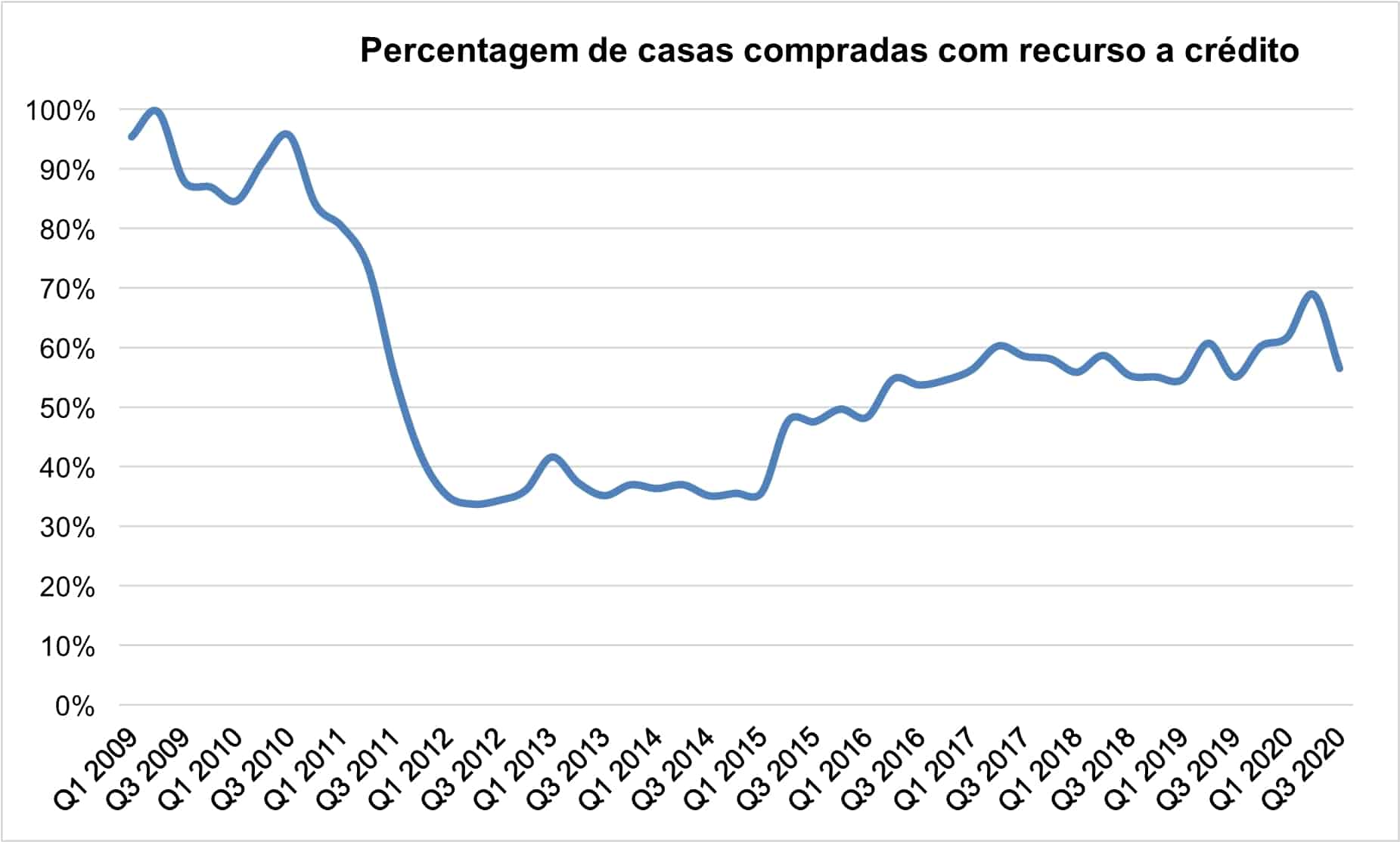 Através dos dados publicados pelo INE e pelo Banco de Portugal é possível aferir que mais de metade das casas compradas no nosso país são com recurso a um financiamento bancário. Como também é possível estimar que em 2009 esse valor atingiu praticamente os 100%.