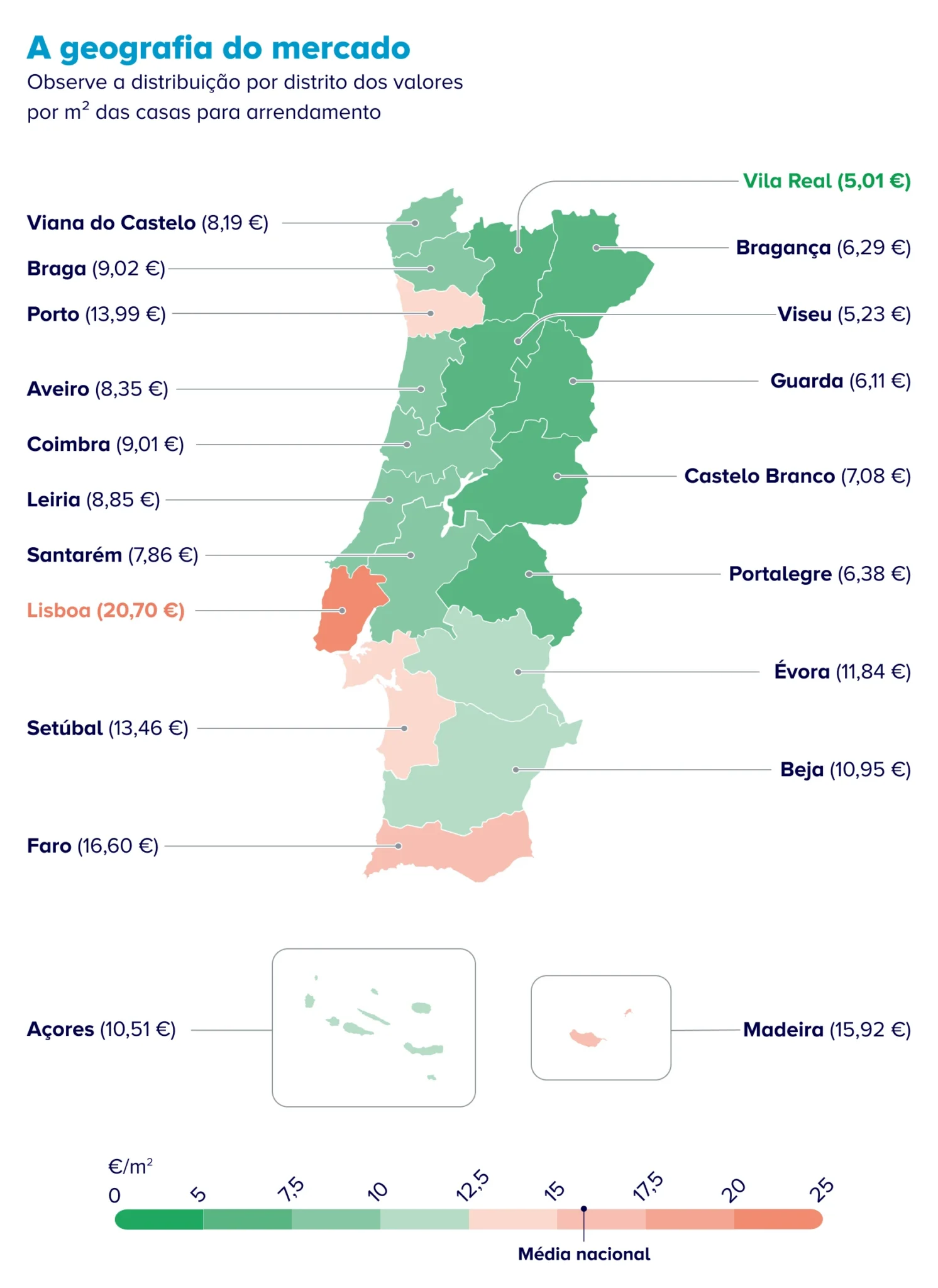 Com exceção de Mora (com apenas um único anúncio listado, à data desta análise), os concelhos com preços mais elevados situam-se nas três regiões mais caras do país – distritos de Lisboa e Faro e Região Autónoma da Madeira. O valor por metro quadrado chega aos 20,70 euros/m², na capital, aos 16,60 euros/m², em Faro, e aos 15,92 euros/m², na Madeira.