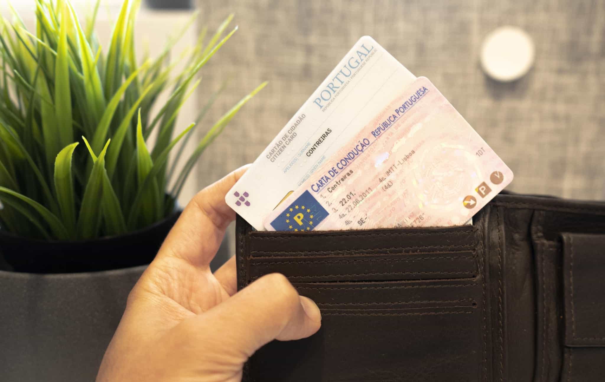 carteira com uma carta de condução e um cartão de cidadão