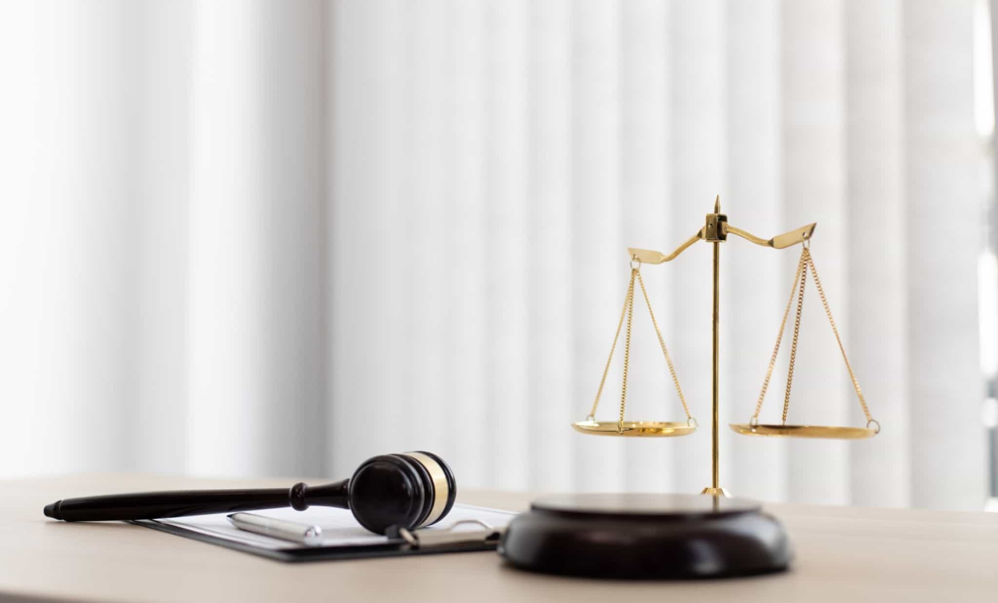 produção fotográfica ilustra questões da lei e da justiça, com uma balança, documentos e um martelo de juiz