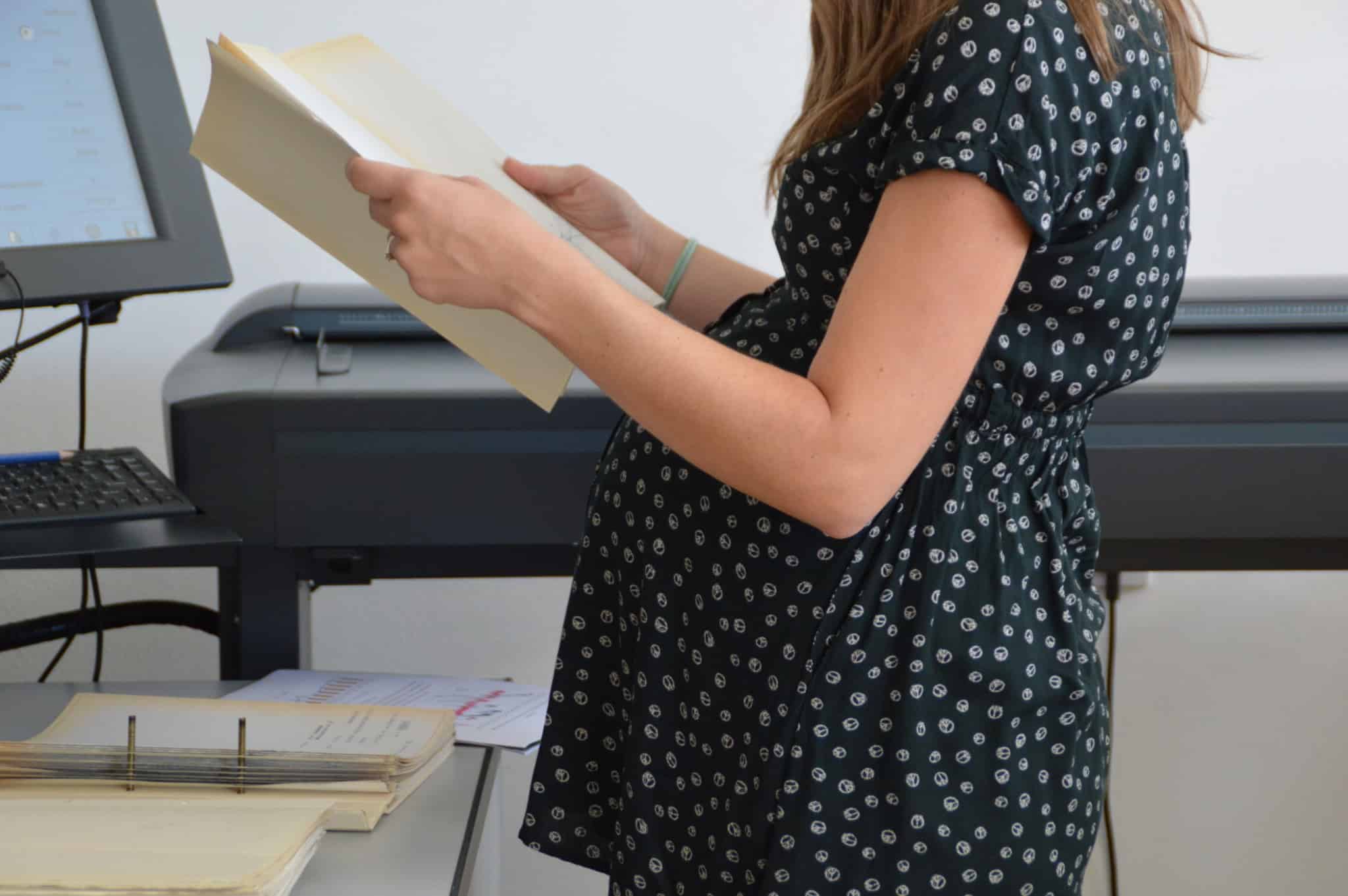 mulher grávida com vestido às pintinhas a segurar numa pasta