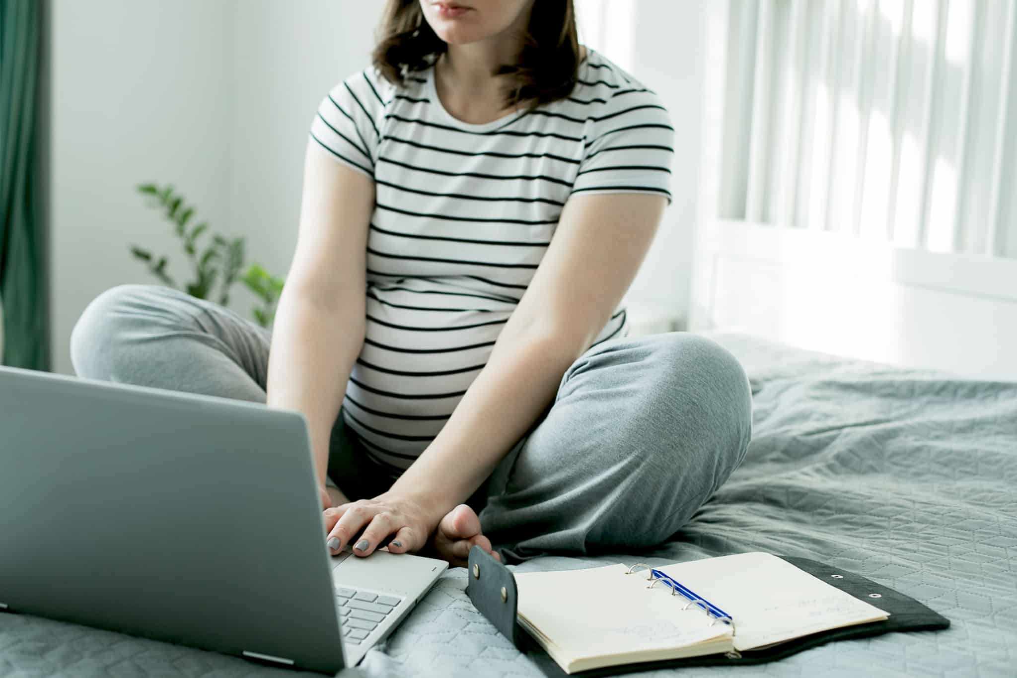 mulher grávida sentada em cima da cama com o computador